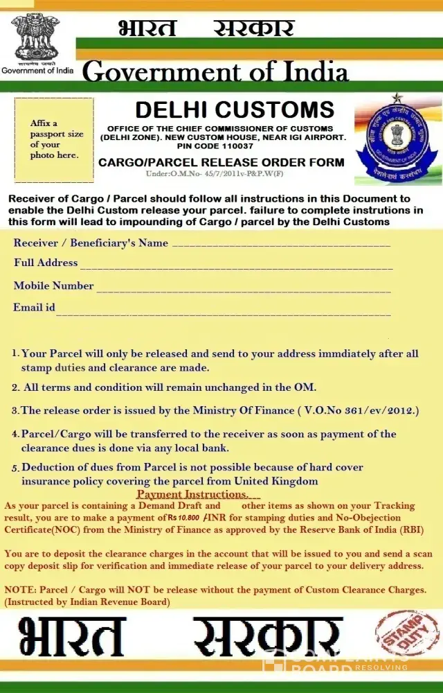 We have also attached a scan copy of the release order form from the indian customs for you to print it out and fill it carefully and send a scan copy of it to our delivery agent diplomat george harry so that he can submit the form to the indian custom clearance department on arrival.