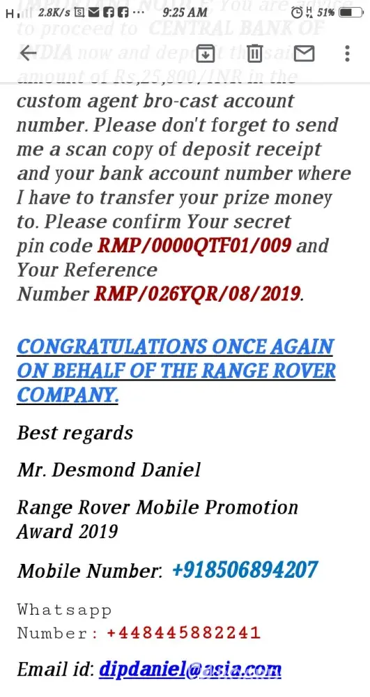 Is't true or fake ..i got same mgs and email from land rover ..my mobile number is 9365237672plz tell me