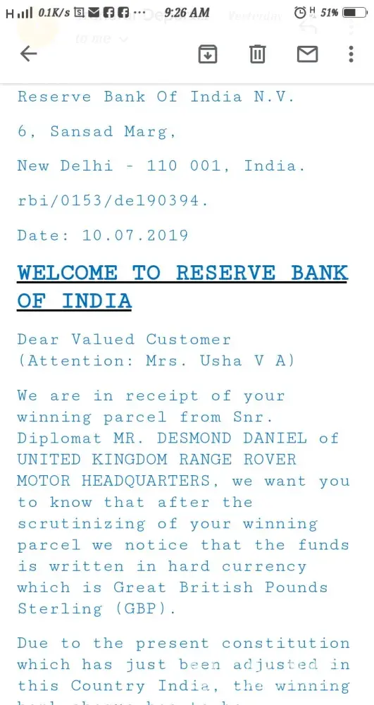 I'm Usha... I got mail from Range Rover Car in UK company... They mail to me two days back I'm a lucky winner of cheque of 4Crore rupees and 2019 Range Rover Car... They mailed to me...