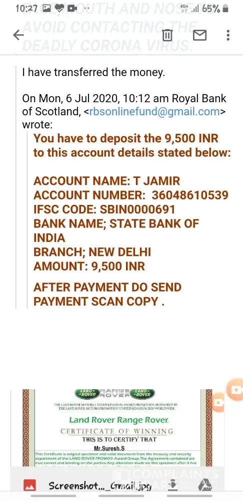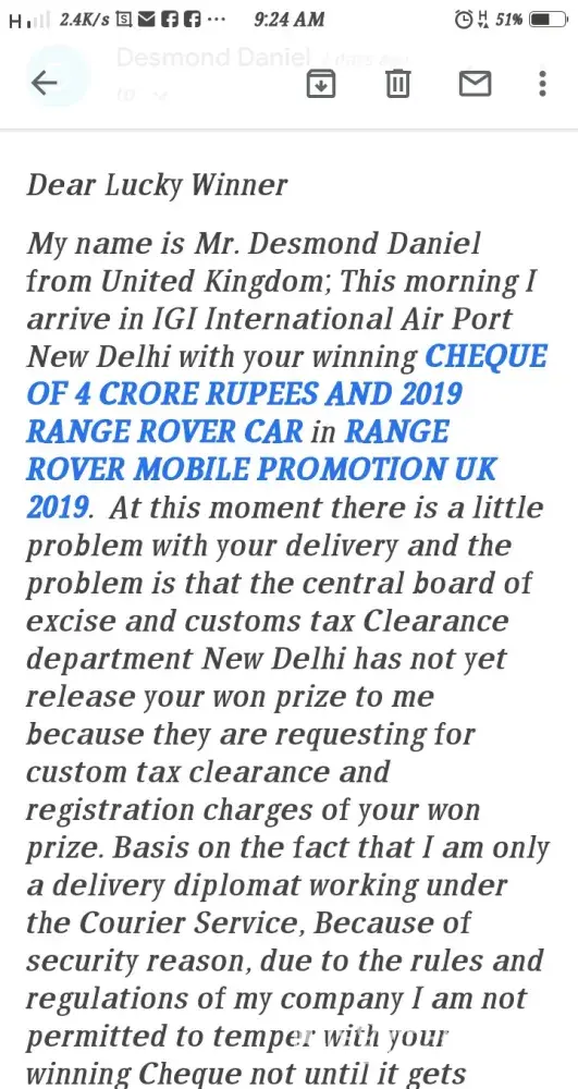 Hence all has been set for the diplomat (mr. morris jay) to proceed with the delivery of your winning funds to your home address which you have provided to this office. our diplomat (mr. morris jay) will arrive india to deliver your winning cheque and 2018 land rover car to you and further proceed to malaysia to deliver other consignment after he must have handed over your won parcel containing a valid cheque of (four crore thirty-five lahks india rupees and land rover car}let it be known to you that all taxes has been paid by the land rover lottery promotion board here in united kingdom therefore, you will only be required to pay for the india custom tax clearing and registration charges which are 24, 800 inr only for the clearing of your cheque from the indian custom authority upon the arrival of the delivery officer to your country capital city (new delhi). to avoid any delay of carrying out his duty as stipulated, you are advised to make available the required amount of rs.24, 800 inr when he arrives to enable him to fulfill the normal indian customs clearing obligations at the international airport for your cheque and land rover car to be released and pass customs clearance without hesitation. you are advised to keep your winnings confidential until our diplomat arrives your doorstep for a maximum security of our diplomat. note: you are advised to contact this email: [protected]@gmail.com with a scanned copy of any form of identity card and ask him to send you the account number where you have to deposit rs, 24, 800 india rupees which are for india custom tax clearance/registration