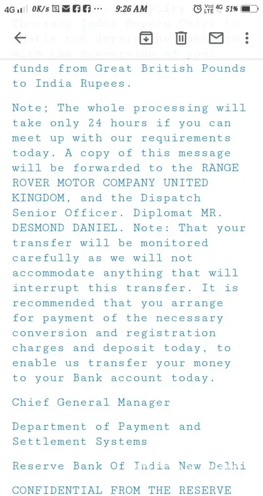 IAM B.jagjeevan reddy I have got mail from the land Rover range Rover that I have won 4cr did it is true should I believe this mail or not