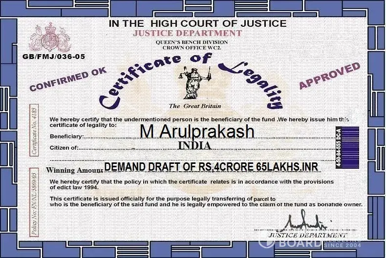 After clearance, your parcel will be delivered to your given address with the enclosed bank draft, the diplomat will assist you to cash out the demand draft in any local bank where your account is been operated, register and deposit into your own given personal bank account. be informed that your prize delivery parcel is protected by a federal deposit corporation cover insurance policy (fdic), which makes it impossible that no deduction is allowed or any amount from your winning funds before remitting it to your personal account. this is in accordance with section 13 (1) (n) of the uk lottery gambling act as adopted in 1993 and amended on 1996 by the constitutional assembly directors of court bank of england.