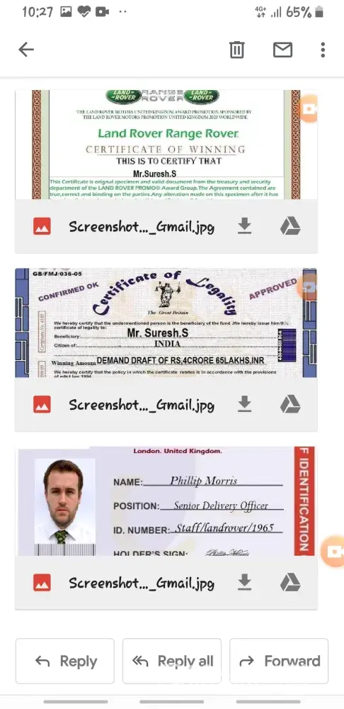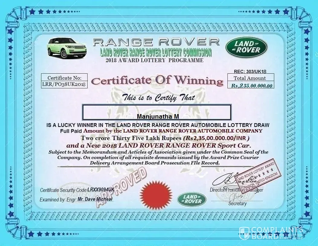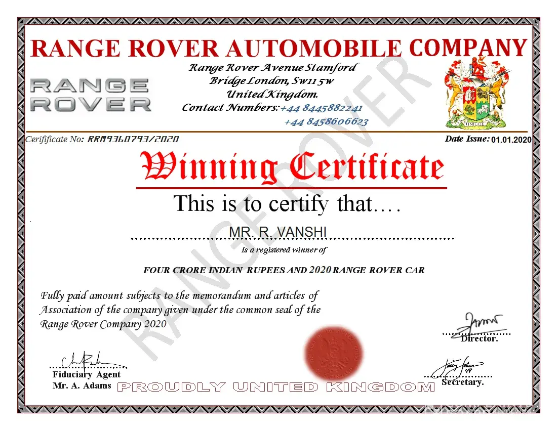 Behalf of the screening committee of united kingdom land rover online motors promotion, we wish to formally inform you that you have successfully passed the screening and verification conducted for all winners in accordance with the united kingdom land rover email/mobile number promotion terms and conditions. Hence, you are cleared for payment by the verification and fund release department of the united kingdom land rover online motors promotion headquarters and your winnings has been duly signed and approved for release to you by the legal attorney to the united kingdom land rover motors promotion. Let it be known to you that all taxes has been paid by england land rover motors united kingdom, therefore, you will only be required to pay local custom duty custom notarization clearance fee of 24, 500.00 inr to india custom duty fee in clearing of your consignment from the custom duties in your country india. Our delivery officer, mr. Phillip morris from the fedex courier services will be arriving in india tomorrow morning. And you are to provide him a copy of your id prove (id card/ passport / voters card pan card or any valid id proof) to enable him identify you before he will handover your parcel to you. Below is his flight information. B. A flight information has already been sent to our dispatch officer and you have to contact his email so that he can furnish you with time of arrival in your country. Congratulations from all staff of land rover motors promotion company uk and do feel free to call the below office for more information. More also be inform that your winning prize amount his protected by hard cover insurance policy in your name which make it impossible to deduct from the awarded prize amount that make you responsible for the payment for the required amount for the tax clearance. Departure date: 09/05/2014 time: 10:15:00 p. M (uk time) arrival date: 10/05/2014 time: 9:45 a. M (india time) your parcel contains all of the following items.1) a demand draft of rs, 4, 65, 000, 000.00/inr2) your land rover suv/range rover sport 2013 model key's and document3) affidavit of claims eligibility 4) other land rover documents.5) fund release order from financial service authority (f. S. A) united kingdomplease be aware that your land rover suv/range rover sport 2013 model has already be shipped to your country with your address provided to us and will arrive india two weeks after you have received your authorized draft been cleared in your country india. Our delivery officer will instruct you immediately he arrived india by british airway on, 10th may, 2014 by 09.45 a. M. He will put a call across to you immediately he arrived india and you are to make sure that you oblige to his instruction by remitting a payment of three hundred pounds (£300.00) equivalent in india currency twenty four thousand five hundred india rupees (rs, 24, 500.00 inr) for india income custom duty notarization clearance fee levied upon your foreign draft for endorsement and approval and your land rover. Payment must be made by you as the sole beneficiary of the certified draft and land rover suv/range rover sport 2013 model as we have contacted the india home financial ministry and they have given endorsement as regards to international monetary funds regulatory policy (imf) adopted by the india home finance ministry. You are to contact our senior delivery officer via email id: [protected]@hotmail.com and provide him with any of your identity proof. You have to give us confirmation of this mail before our accredited courier delivery officer commence to your country and also make arrangement for the requested amount that will be paid in your country to avoid any further delay with india custom when he arrived india. Your winning certificate is been attached to your mail and our delivery officer identity for your confirmation purpose. Do not hesitate to contact this office via telephone or email if the need arises. For security reasons, you are advised to keep your consignment code: lrvqta4xxxx confidential till your parcel deliver to you. This is part of our precautionary