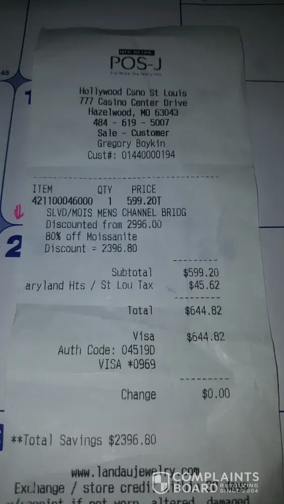 I brought a mens 14k gold ring yesterday at Hollywood Casino St.Louis . The ring cost 644.00 . It was 80% off which stop me from a refund because your company don't allow a refund on item's sold at 75%. These items are considered final sales. I' didn't realize this until I got home and read at home my receipt . The sales person should have explained this to my before I purchase the ring. I was spending a lot of money and she was just concerned about making a sale. The ring was gold plated not 14 k gold. The sale person assured me that it was gold. I'm reporting you to the BBB and I will be filing a claim of fraud with my credit card company.
