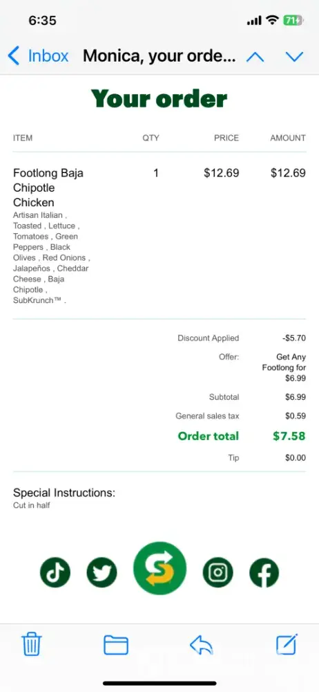 I’m still waiting for a response email sent to Guest Services for an order placed on 4/2/25. I ordered a footlong baja chipotle chicken which was missing the chicken.