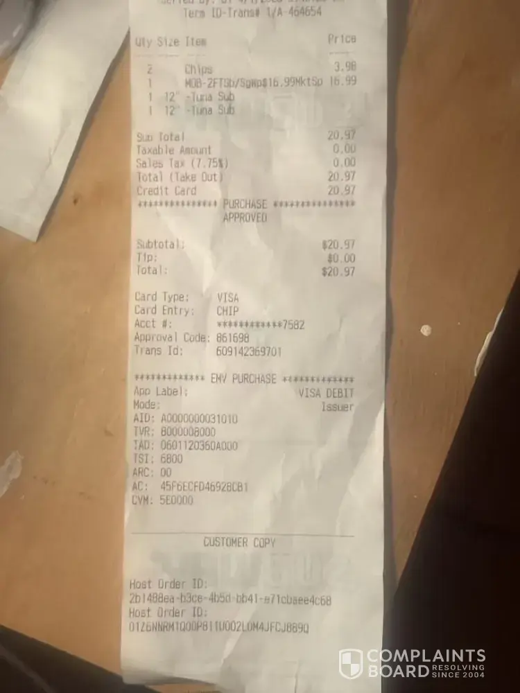 I visited the Subway store 1/24/24 at 5:28pm. I did not receive my military discount and was overcharged one dollar. My change was to be $7 and was given only 6 dollars back.