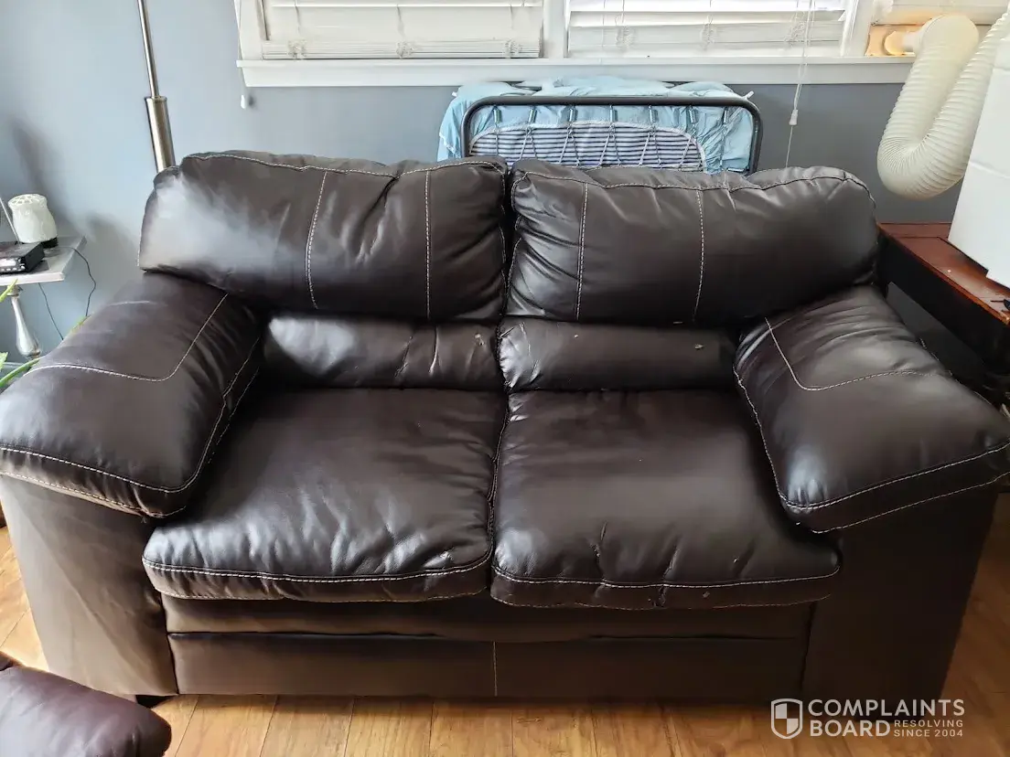 Love seat was delivered on 12-23-2019 purchased from classy home model number50280-BR-63 2021 October item is peeling nothing has been done I live alone no pets Or children this love seat is now