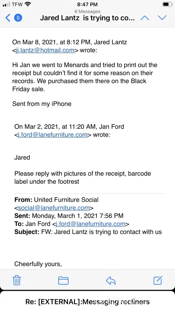 We purchased two Lane recliners from Amazon on May 17 and they were delivered on May 30, 2019. On one of the chairs the support on the rear bottom the plywood broke where a hole was drilled. As a result the chair is falling apart in two directions. The left hand arm is about to fall off. I do not see a way of repairing it. I have pictures but there are on a computer that crashed last week. If you send me your email address I will send them from my phone