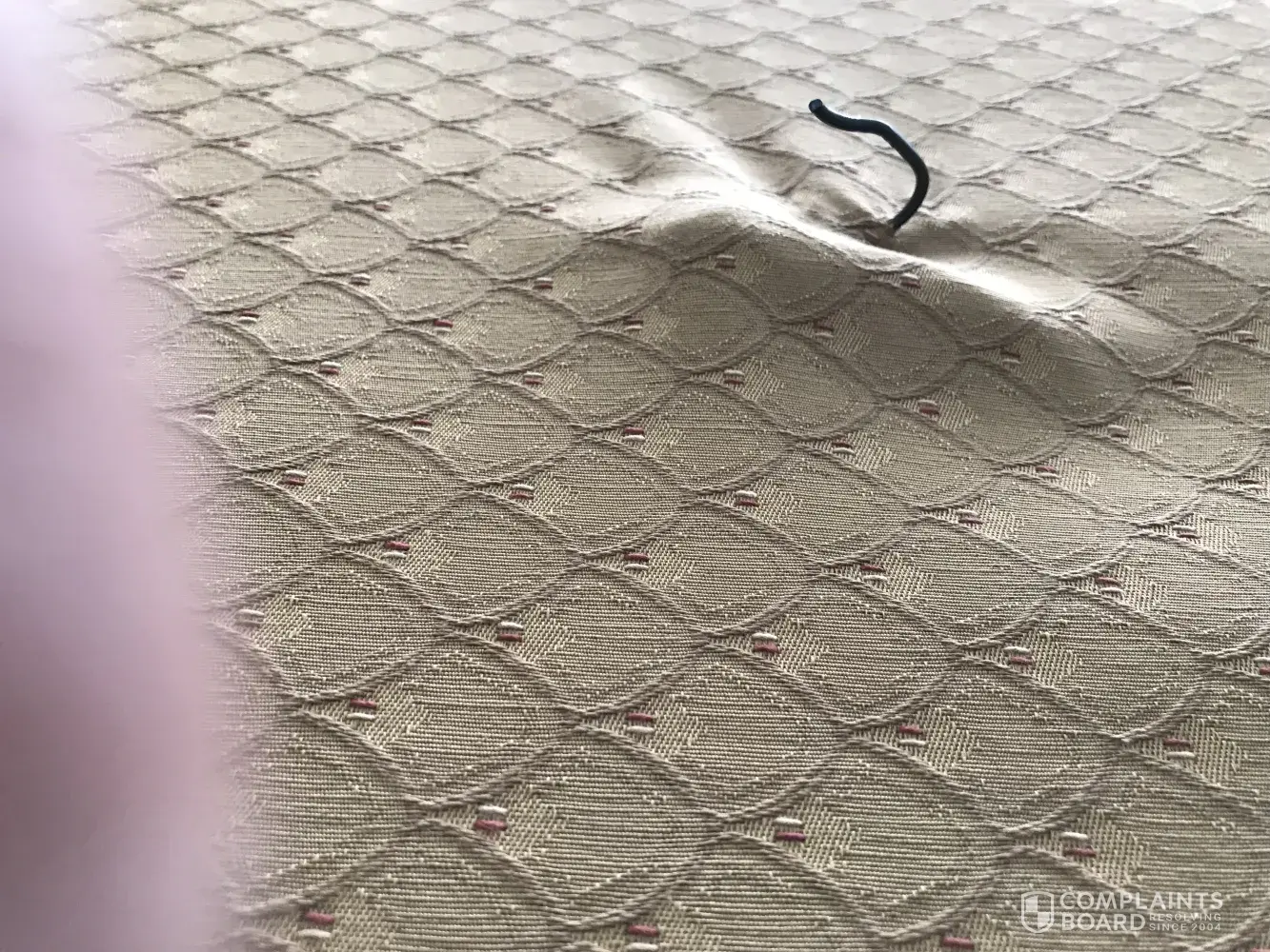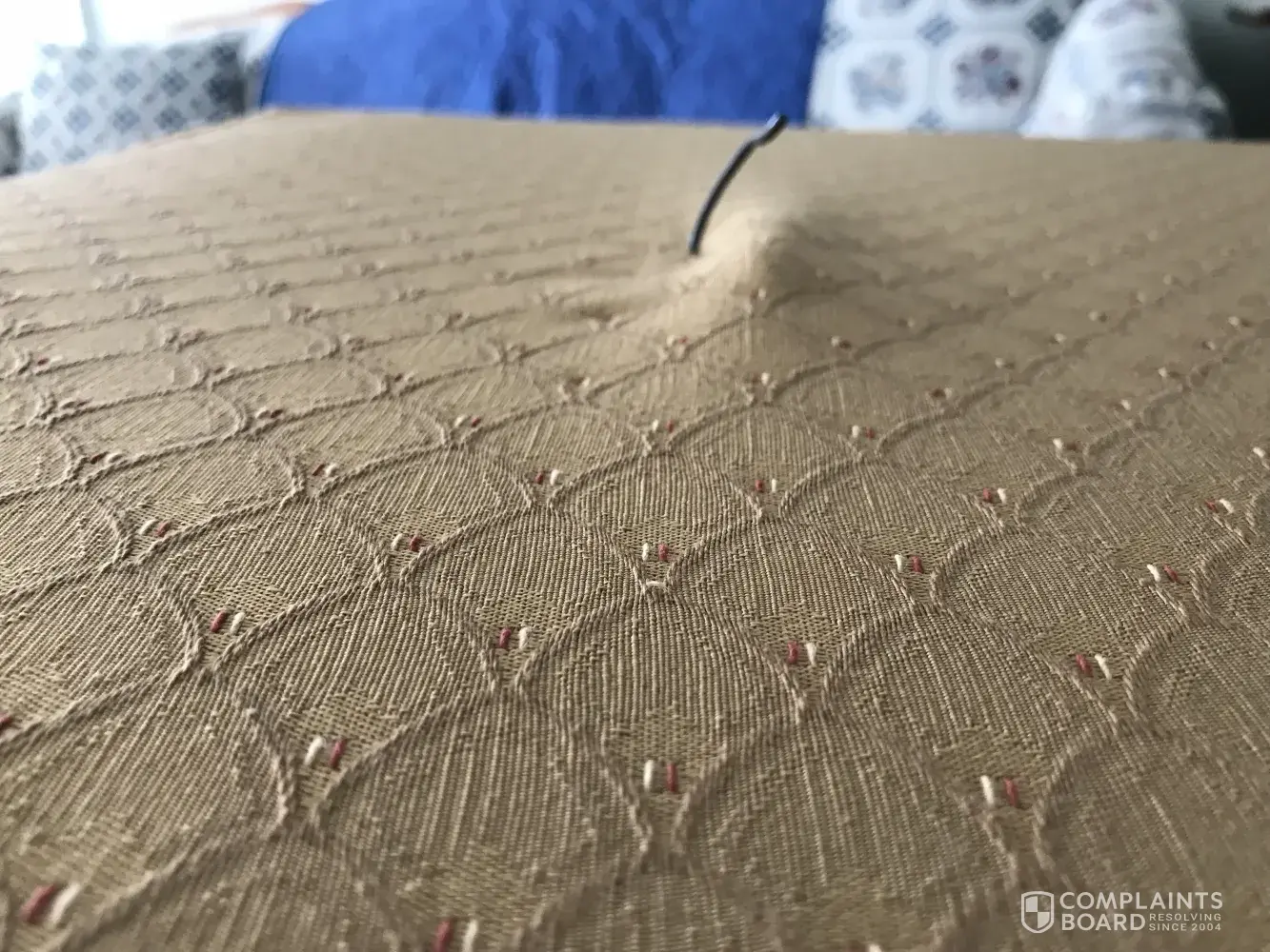 A recliner purchased on 12/06/2017 and delivered 12/15/2017, item used two weeks in december and then not again until may 5th (we were in florida all winter) on app. May 7th I pulled the chair away from the position it was in to plug something into an electrical outlet and saw that right in the center of the back of the chair what looked like a piece of a spring had poked out thru the fabric and was sticking out 3 inches. The chair was purchased at carson pirrie scott in lombard illinois. This store is out of business.