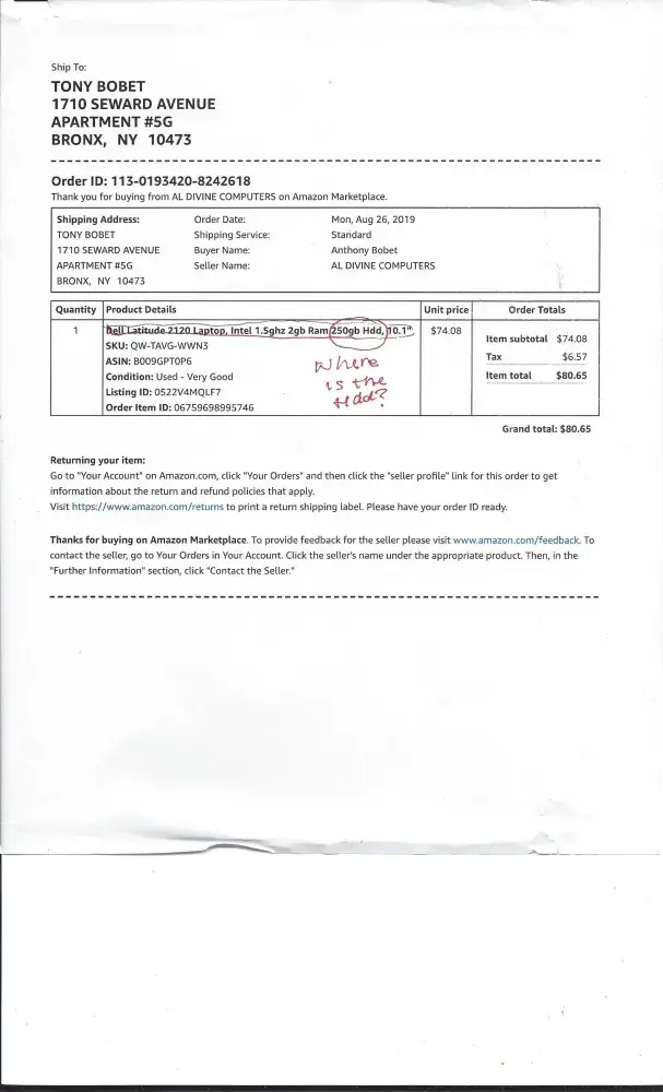 Dear Sir/Madam. i am filing an complaint that I bought from Amazon/seller: AL Divine Computers. They're located at 1131 Clinton Avenue, Irvington, New Jersey 07111. I order the item on Monday, August 26, 2019. For $74.08 + tax $6.37 = $80.65. I received on Wednesday, August 28, 2019. By the UPS and Who sign for the item is my brother, Raul Bobet. Below of...