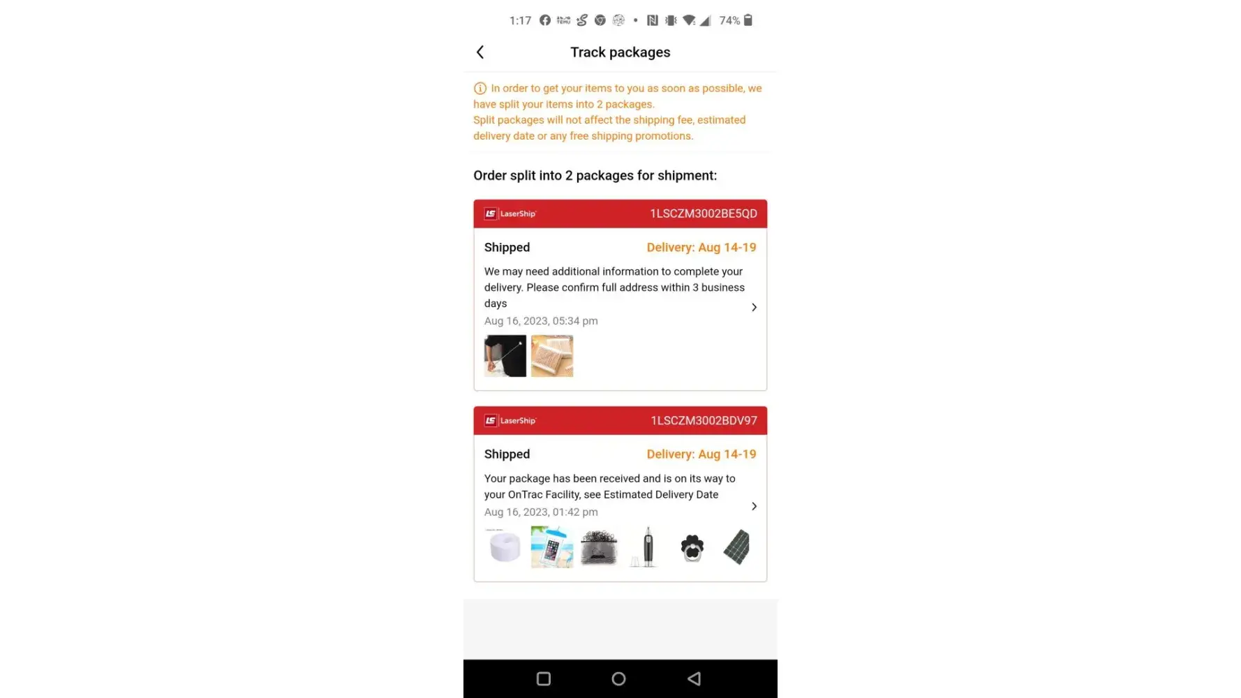 8/16/2023 Lasership delivered did not happen. On Lasership page says they did not have address to deliver my package at 5:40pm. At 10:15am Lasership delivered my package at my place. Nope they did not. Then add another package was part of it was on 8/17/2023 LaserShip delivery. That didn't happen. At 3:30 p.m. package had delivered at my place at 11:10 a.m. next door on the left side. That didn't happen. No truck no person no pictures no video and no packages at my place on that day which is today. Trying to talk to them but nothing computer will not do nothing for you make it worse just like that company is and I'll see I believe they stole it but not. I have more package unfortunately come from them. To me I'll never use those people again leadership is definitely not leader!