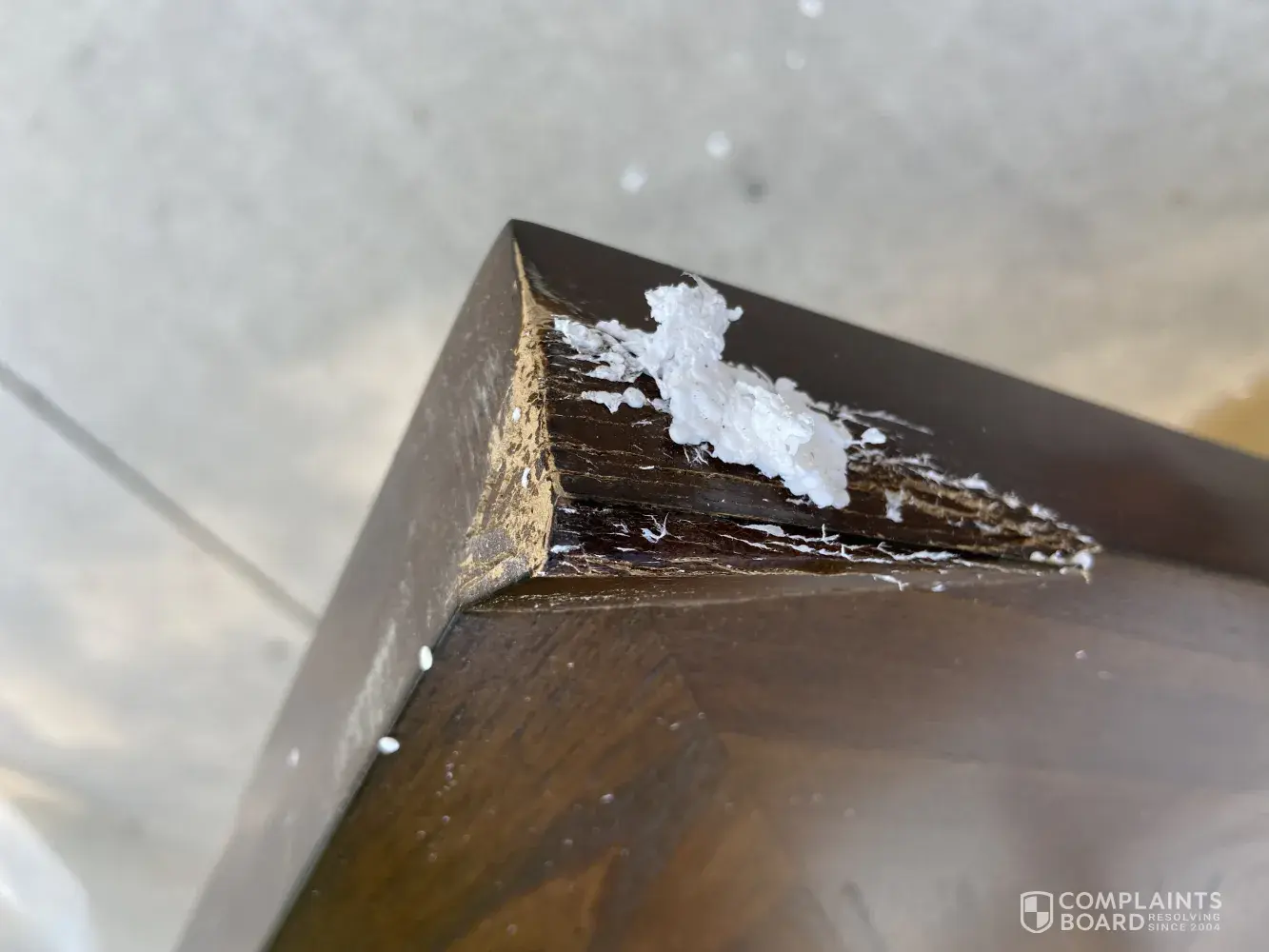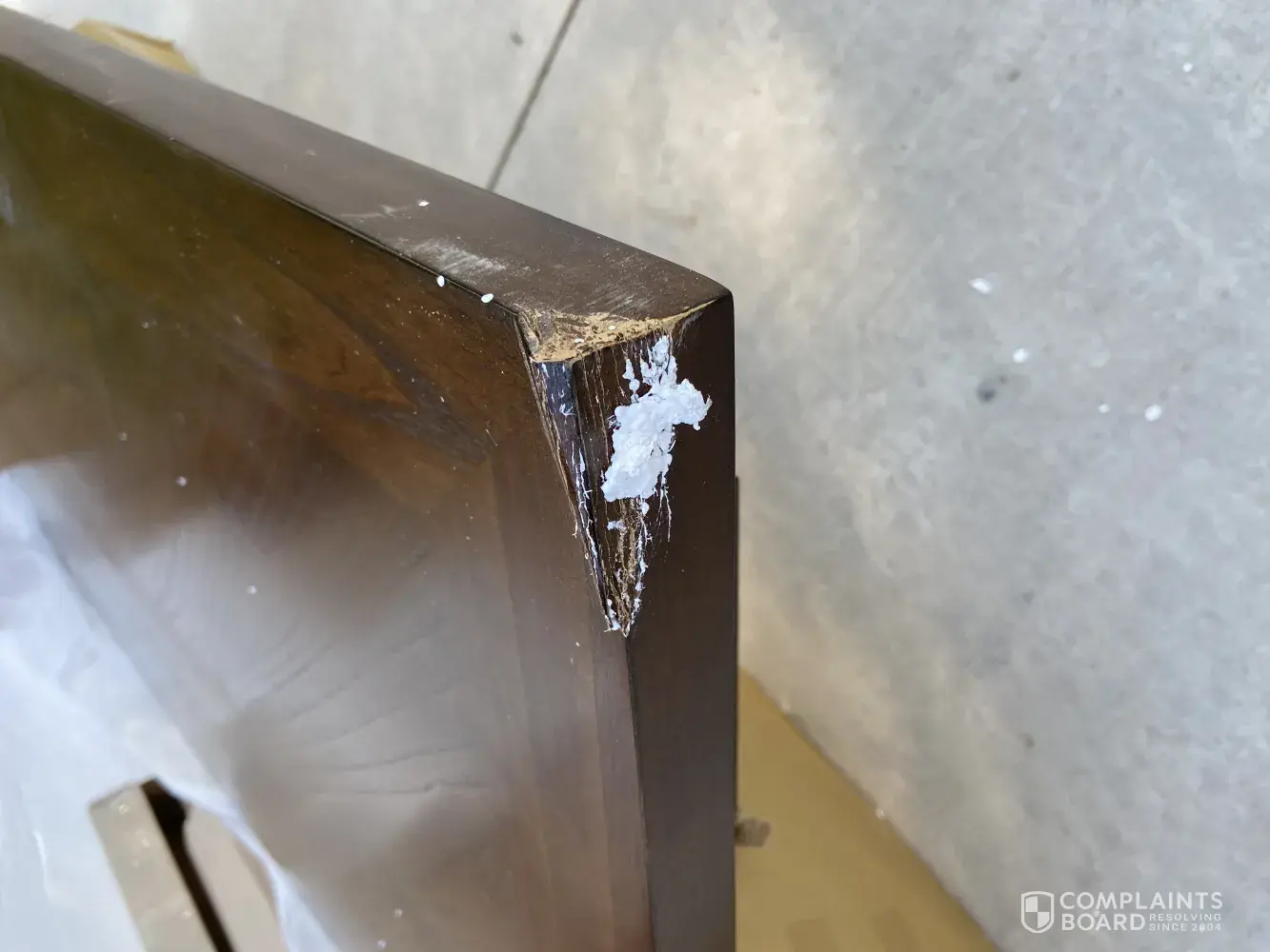 Box was unloaded onto our driveway and when we unpacked it the table top corners on one side were damaged. Pictures show the styrofoam packing that got pushed into the damaged corners.