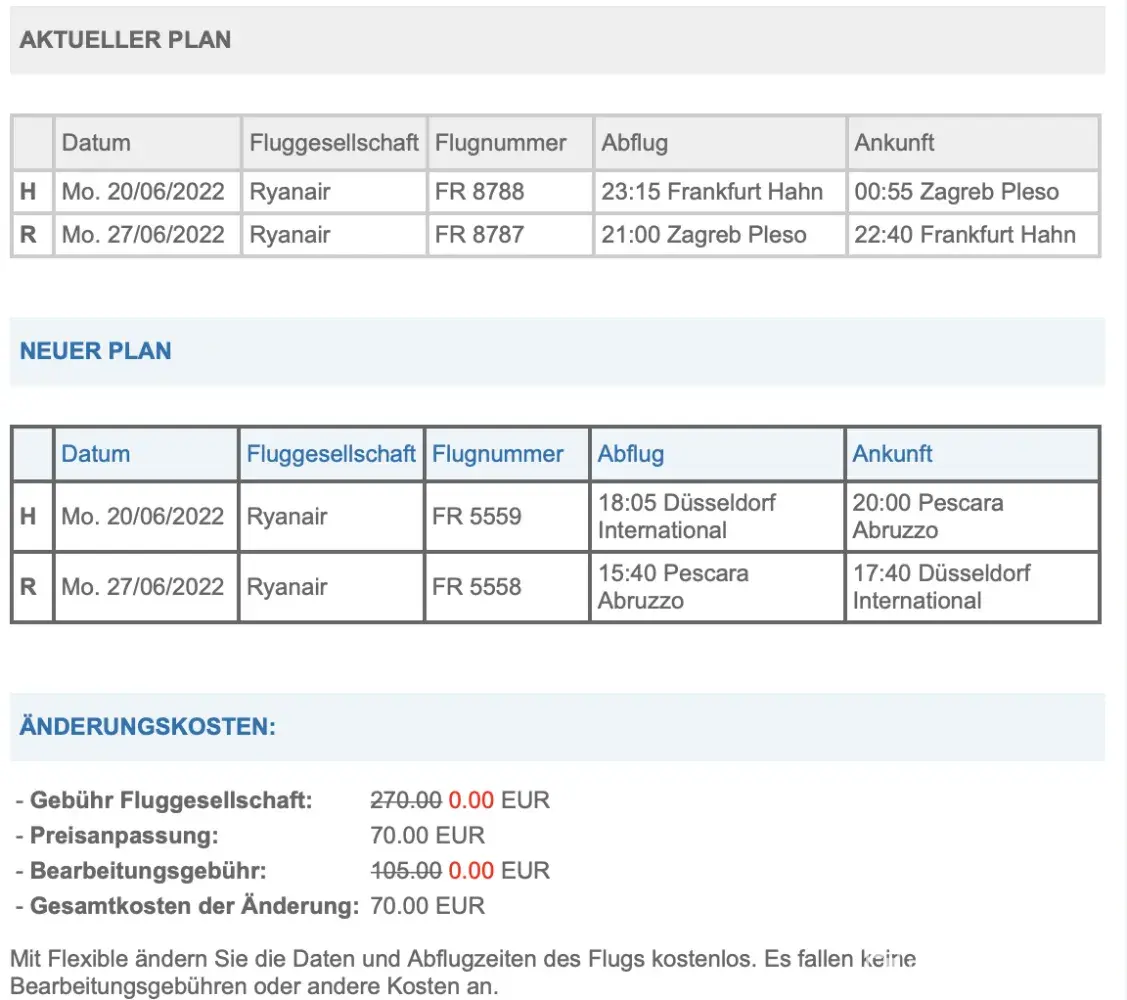 9. (9.June) We asked for a change of date then, another option was cheaper. Again Düsseldorf Weeze - Pescara, Italy. Just 1 day later. Online the ticket was available for 130€. Again, they would send the request to the other department to check the tickets and to send us the offer.