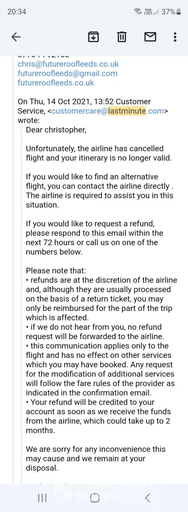 Today, 30/11/21, I have recd a refund voucher for the sum of £25.65 to be used on further bookings. This sum is totally unacceptable for the extra travelling, stress and anxiety caused. I have tried to contact Last Minute Customer Services but the number given, [protected], obtained from their help page, is NOT recognised.