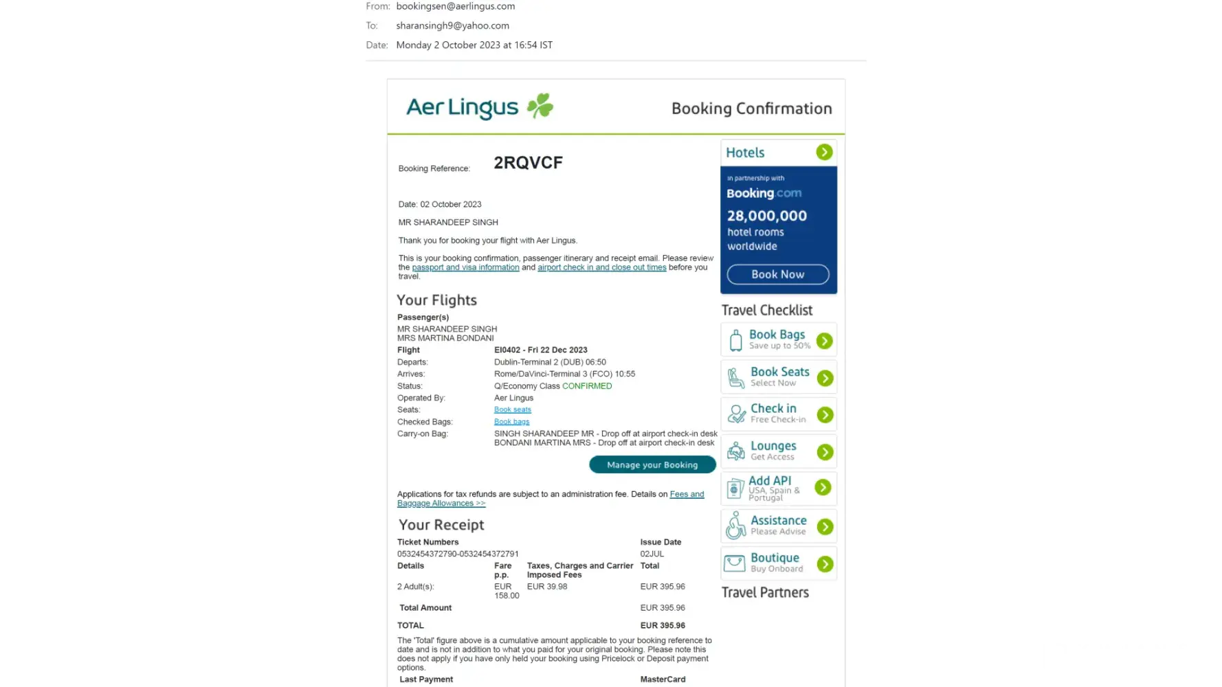 I booked online this morning for a return Loganair flight from Southampton to Edinburgh from 27 to 30 November 2023 and a three night stay at Voco Hotel Haymarket. I did not receive an email confirmation so checked my account online with does not recognise my email address and tells me my booking (reference [protected]) was booked using [protected]@yahoo.co