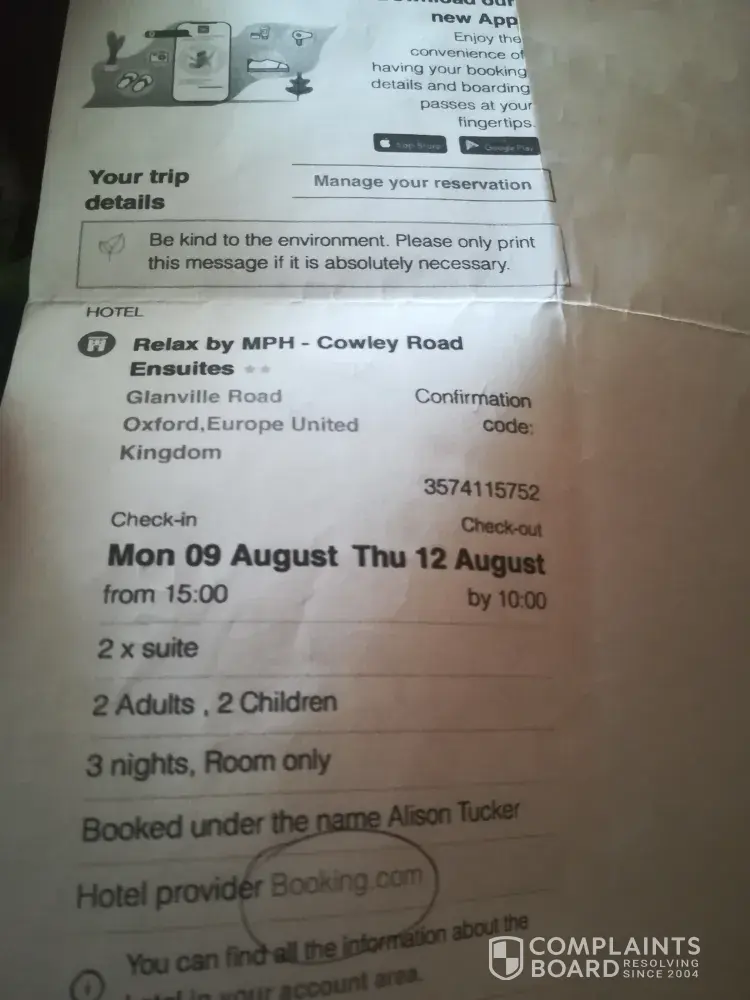 I paid 210 pounds on 23rd May 2021 for three nights at Relax by MPH Cowley Road Ensuites in Oxford, and received confirmation code [protected] and booking reference [protected], via Lastminute.com.