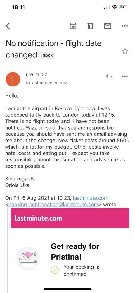 I had booked a ticket with lastminute.com to fly back to London on 06 August 2021 at 12:15, from Pristina International Airport in Kosovo. Booking ID [protected].