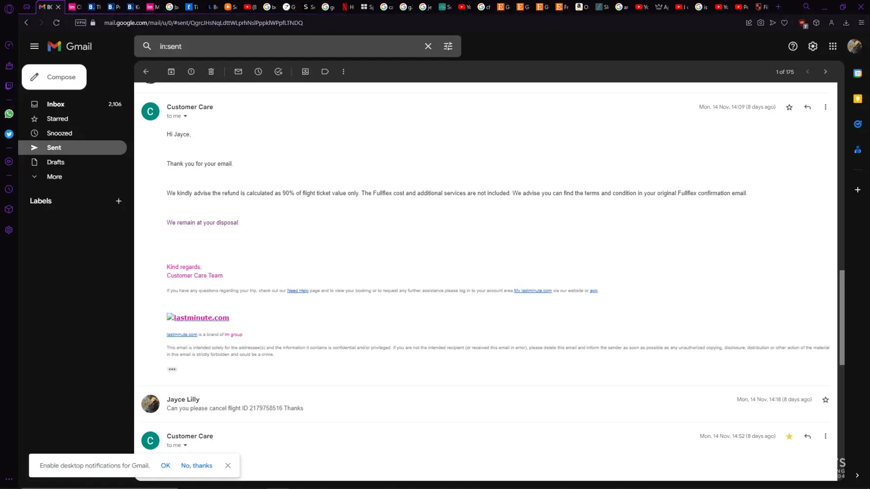 No response from lastminute.com, so I again chased on 14.11.22. No one responded back.