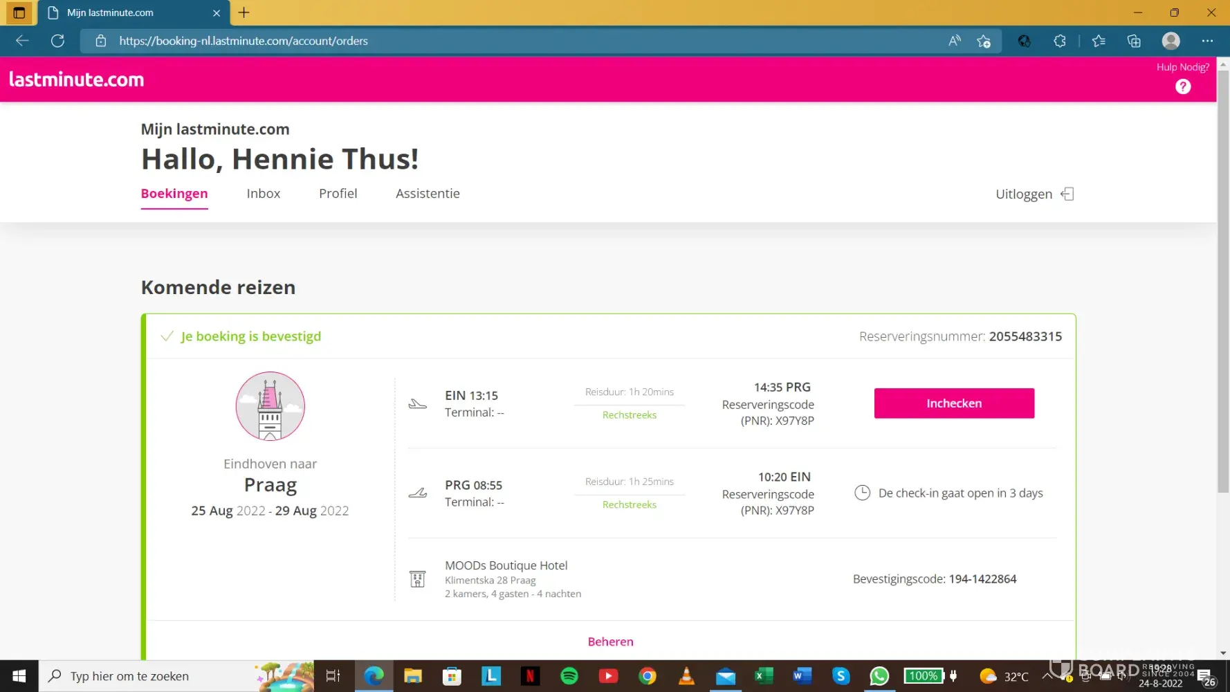 In ons boekingsoverzicht stond nog steeds de terugvlucht op 29-08-2022.