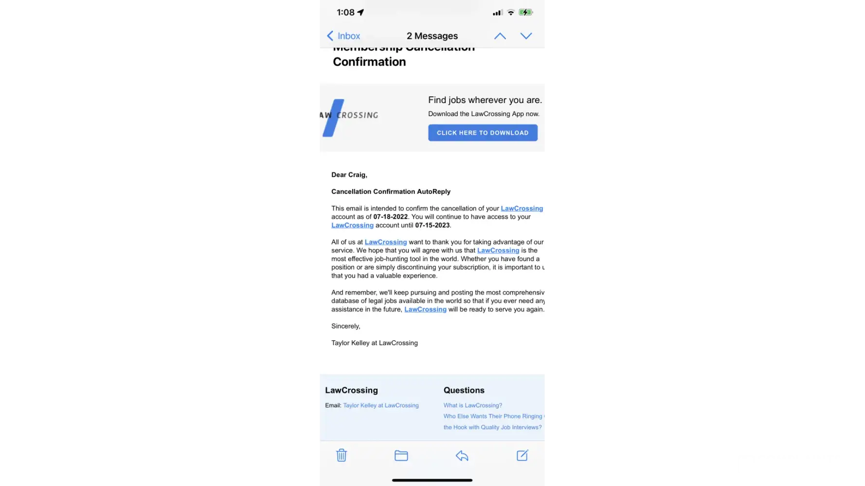 Wow, LawCrossing is still scamming job searchers. Do not waste your money on this useless website. You can find better job listings through craigslist, your local bar association website, indeed.com and other free sites. I found LawCrossing.com to be useless with out-of-date postings and useless information. The only thing I got from LawCrossing was a bunch of SPAM.