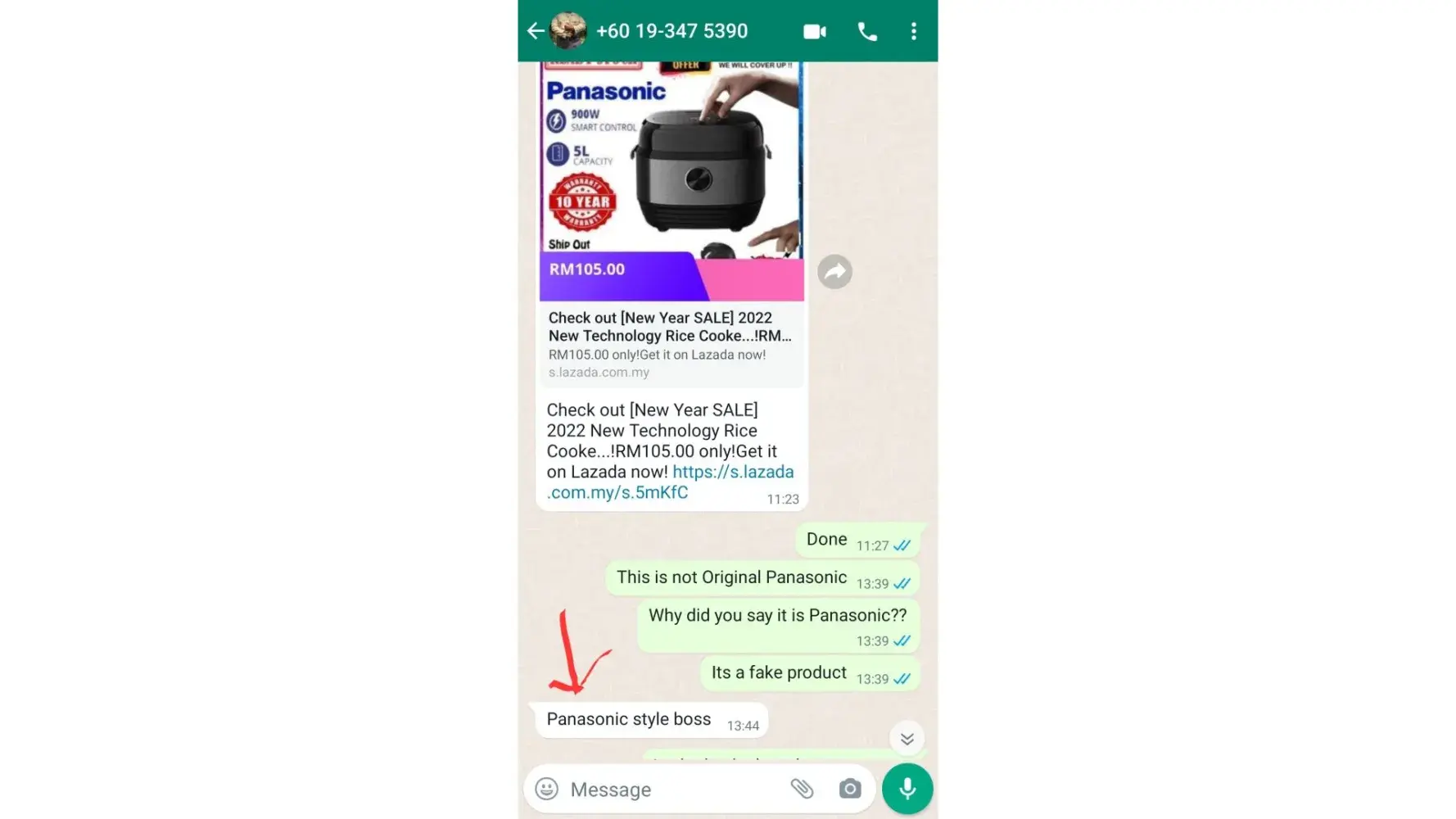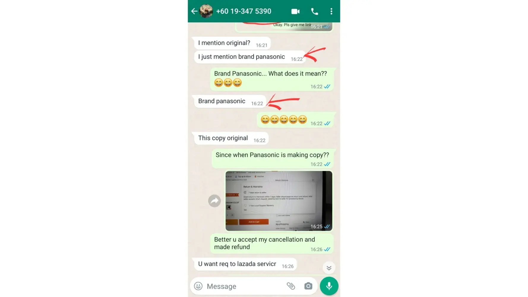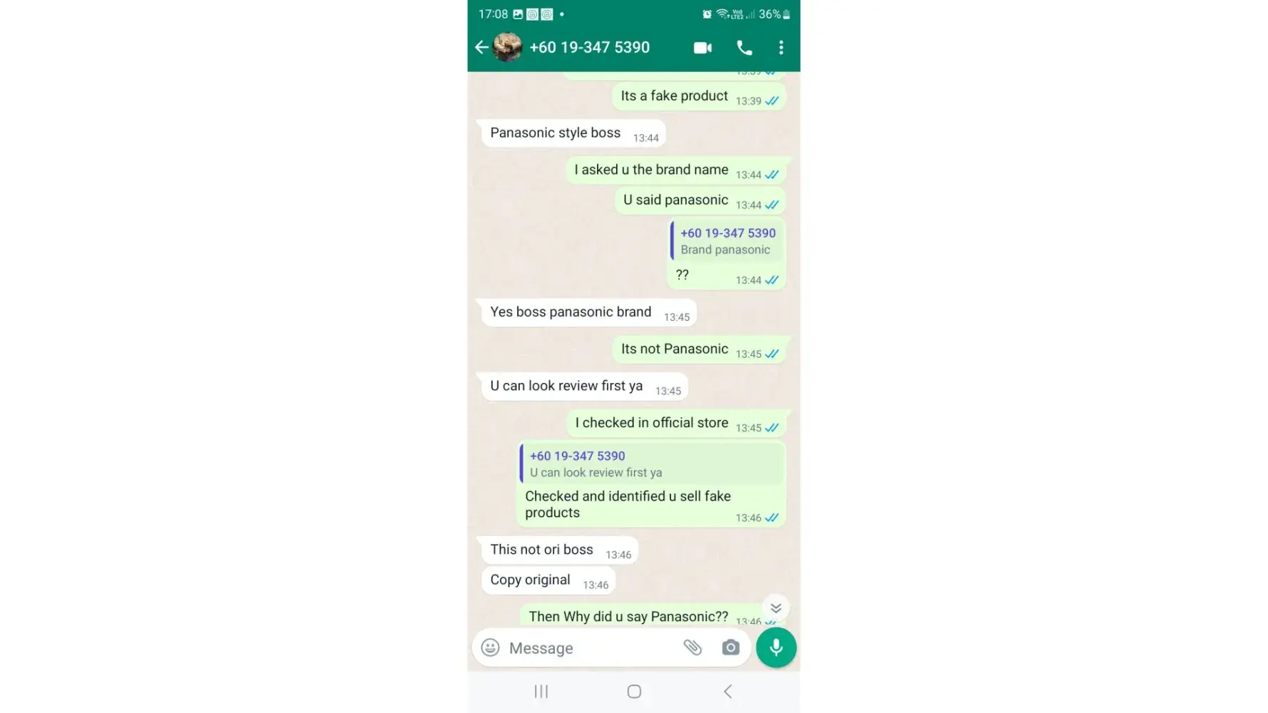 The next day in the morning (7.22 am) I have received a whatsapp msg from the seller (NjoyShopping) whether I am interested on buying it or not. During our conversation, I asked him what is the brand name. He mentioned PANASONIC. After getting this to know, I made my payment at 11.27 am (order no: Order [protected]). (Pic-2,3,4)