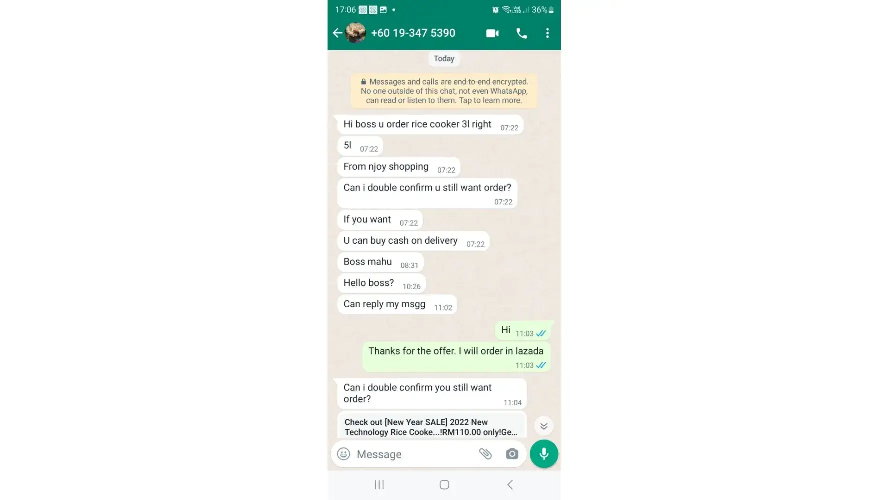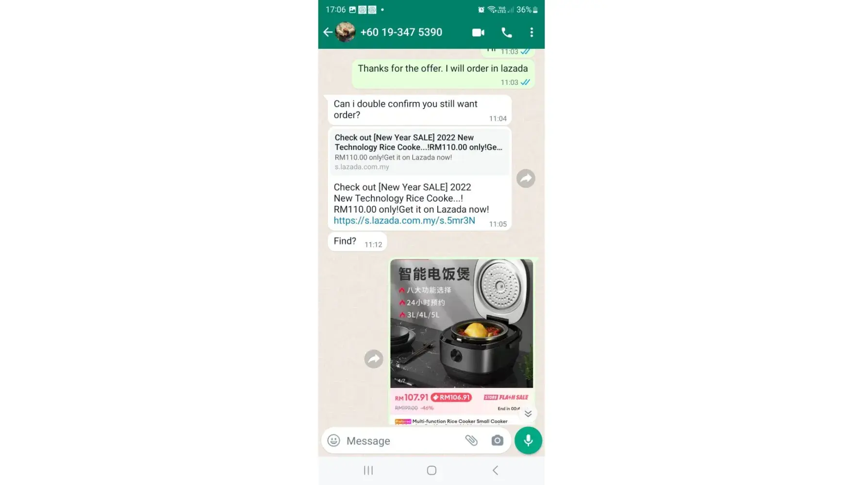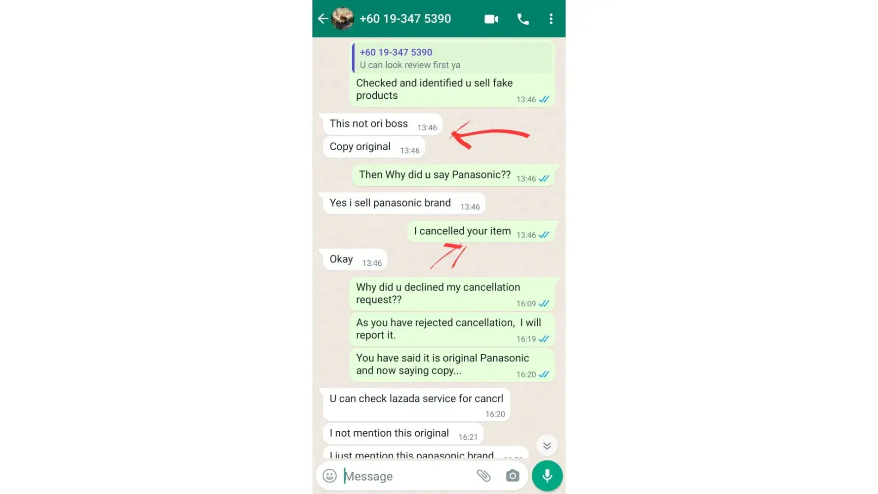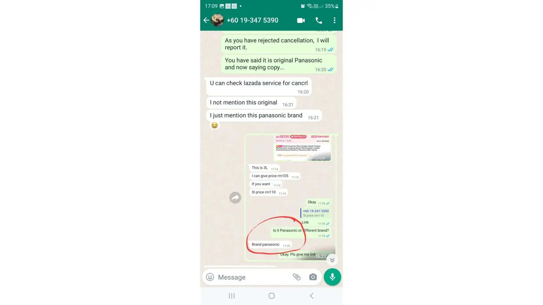 The next day in the morning (7.22 am) I have received a whatsapp msg from the seller (NjoyShopping) whether I am interested on buying it or not. During our conversation, I asked him what is the brand name. He mentioned PANASONIC. After getting this to know, I made my payment at 11.27 am (order no: Order [protected]). (Pic-2,3,4)