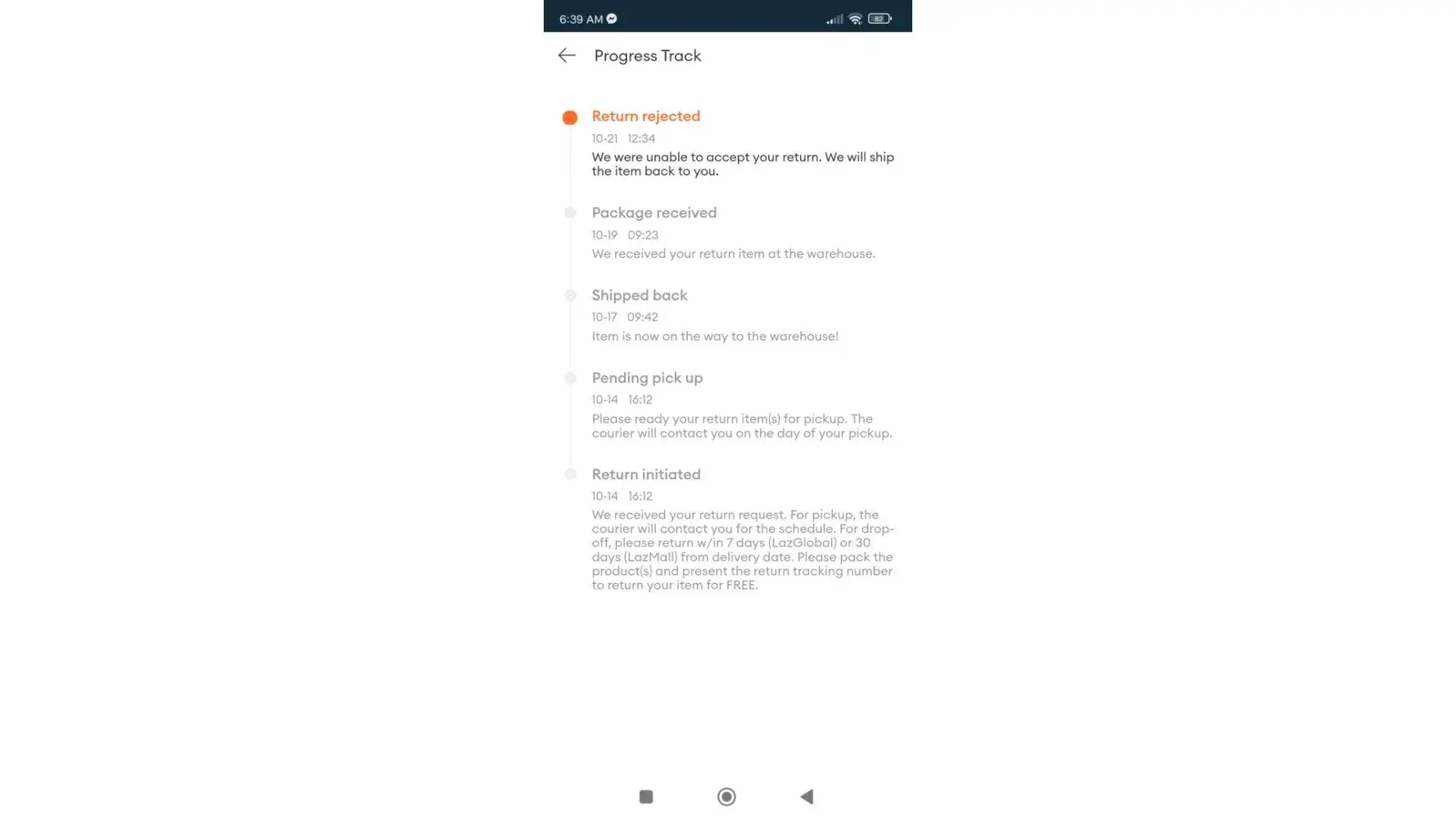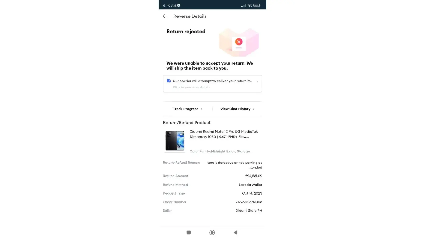 After being rejected by the store, we immediately contacted the store to talk about what can we do about it. But they're not responding up until now. We even contacted the Lazada Customer Support to report the case but they also can't do anything. We're so disappointed by this. They said that the seller did not pick up they're phone call. We reported it multiple times already but there's still no progress.