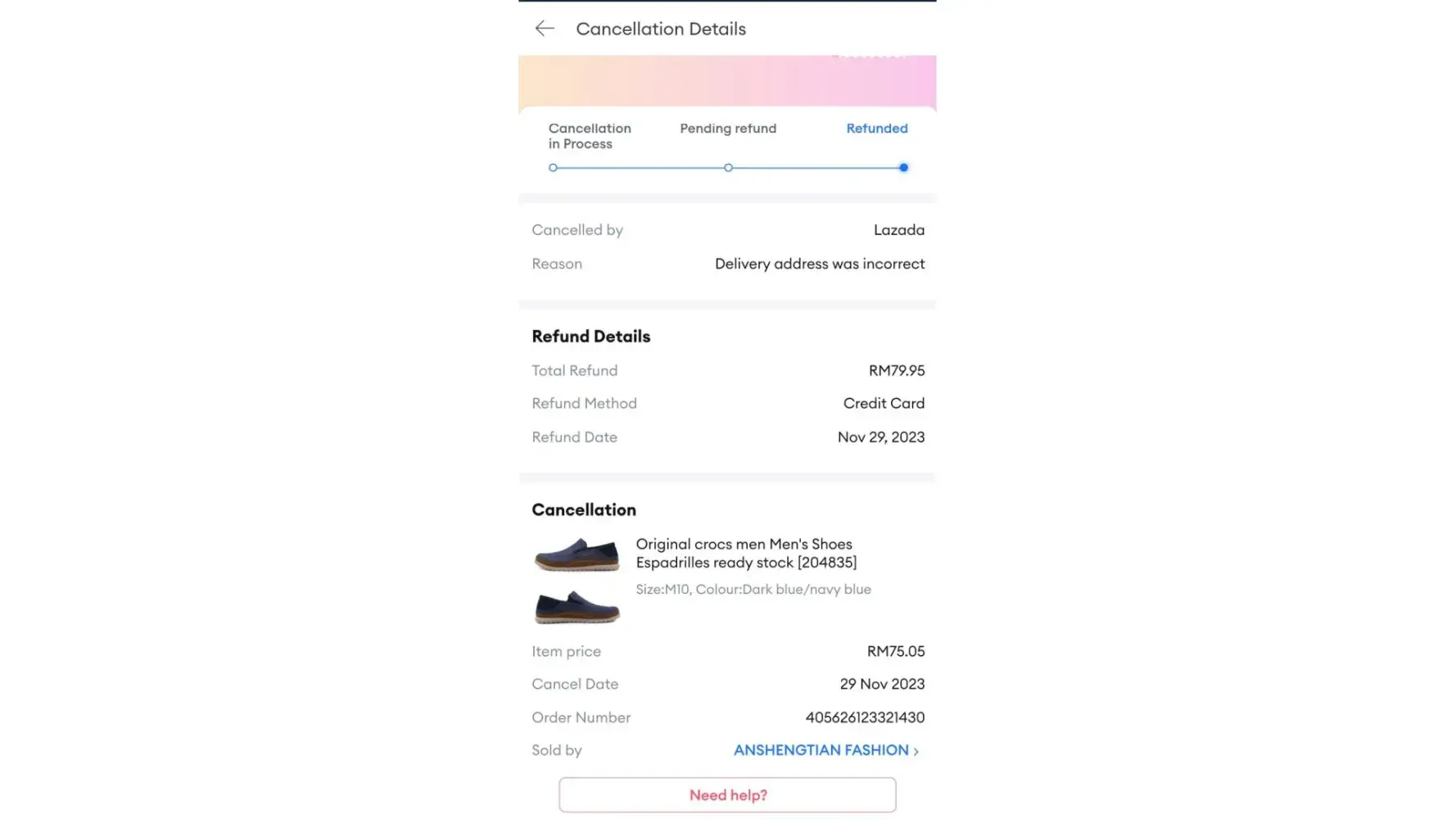 Desired outcome: Cancel the item and refund it.