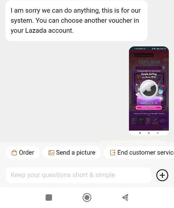 Won an Apple Airtag from their tap & win minigame on 25/06/2024, was given a voucher $45 off minimum spent $0 for an Apple Airtag. When clicking redeem on the button, it directs me to the Apple Airtag listing, but was unable to check out using the voucher to redeem my prize because Lazada placed the item under promotion discount. Contacted support via...