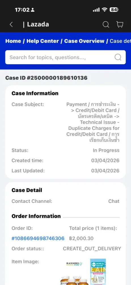 Lazada Thailand — Duplicate debit charge, refused refund, Case 2500000189610136 What happened: On 3 April 2026 I placed one order on Lazada Thailand (Order No. 1086694698746306) for THB 2,000.30. My Bangkok Bank Be1st debit card (account ending x3786) was charged twice — at 01:45 and 01:47 — two completely separate transactions with different bank...