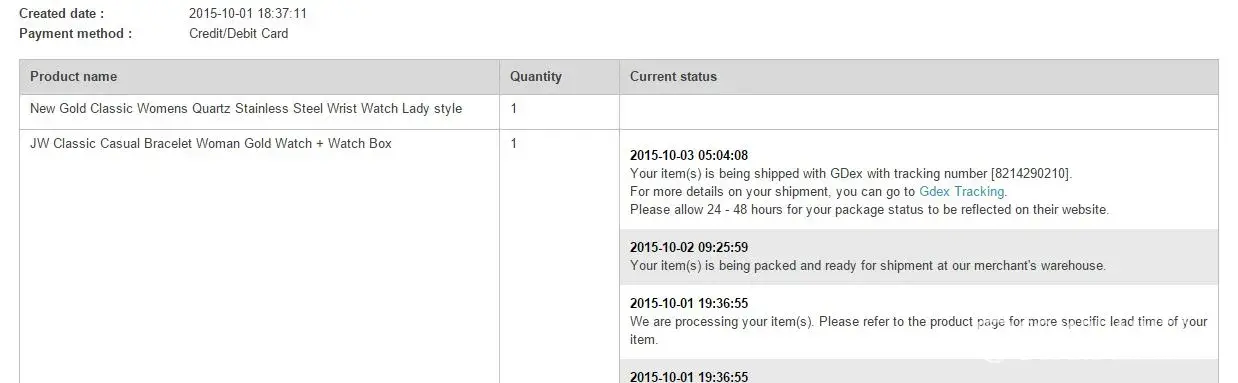 I have purchased new gold classic women's quartz stainless steel wrist watch lady style on lazada by fallowing detail: order # [protected] has been placed on thursday october 01, 2015 via credit or debit card qty: 1 seller: fashion deal there is no update on delivery of it when I check the status is totally blank. (attached the image)