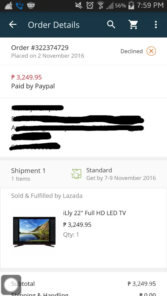 I order a led tv and a wardrobe closet last year November 2, 2016. My order got declined and I recieved only one order number. I been sending emails to lazada's customer service but until now I didn't get my paypal refund.