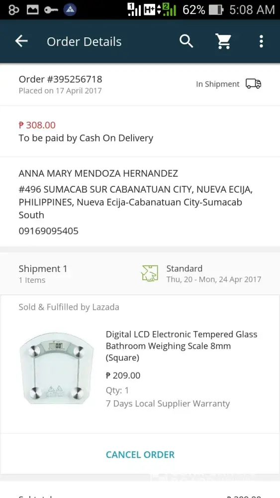 Lazada txt dec 12, 2015 " lazada - your order [protected] has been received and is going through verification process. an order confirmation email was sent to your mailbox." lazada txt dec 16, 2015 " lazada - your order [protected] is being shipped. please check your email for more info on the shipment." lazada txt dec 18, 2015 " lazada - we are delivering your order [protected] to you todat with lex. please prepare cash for payment." up to this hour... no delivery! very poor service!
