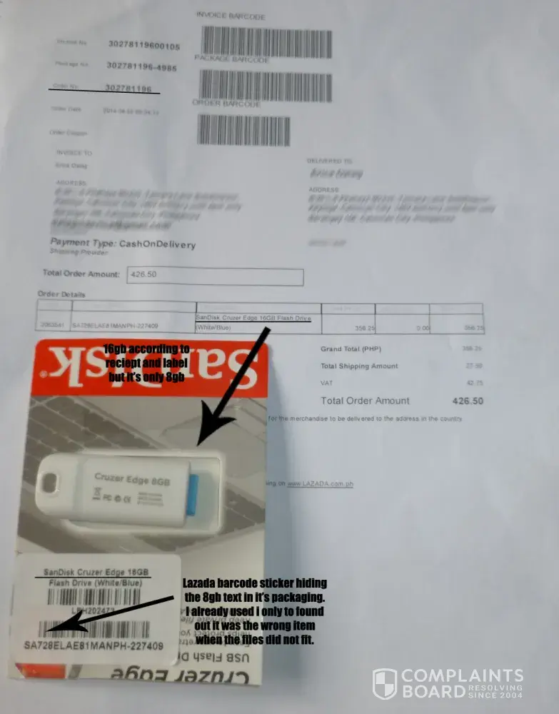 I ordered from Lazada.com last August 21, 2014 and received an email that the item just arrived in their warehouse last August 27, 2014 and will be ready for shipping once cleared. So they are already delayed from their 5days max. I let it go, because they replied to me on my follow-up. Then the parcel was delivered and only to realized they sent me the wrong item. I ordered and paid for a 16gb usb and received an 8gb usb instead. I was due to sent the files to Australia using that USB the next day so I can't return it anymore. So I emailed them to issue me a refund because I paid for a 16gb USB since that's all i can get for sure. No one from their customer service replied and when I contacted them in Facebook they just deleted the post where my inquiry was made... So bottom line is, LAZADA.COM is the worse online store I've encountered. I've been shopping online since 2012 and never have I encounter this much dismay. They even hide the 8gb text on the packaging using their bar code sticker. What a disappointment it has been dealing with them. Even the delivery guy was unprofessional complaining to me that his route for the day is very unorganized.