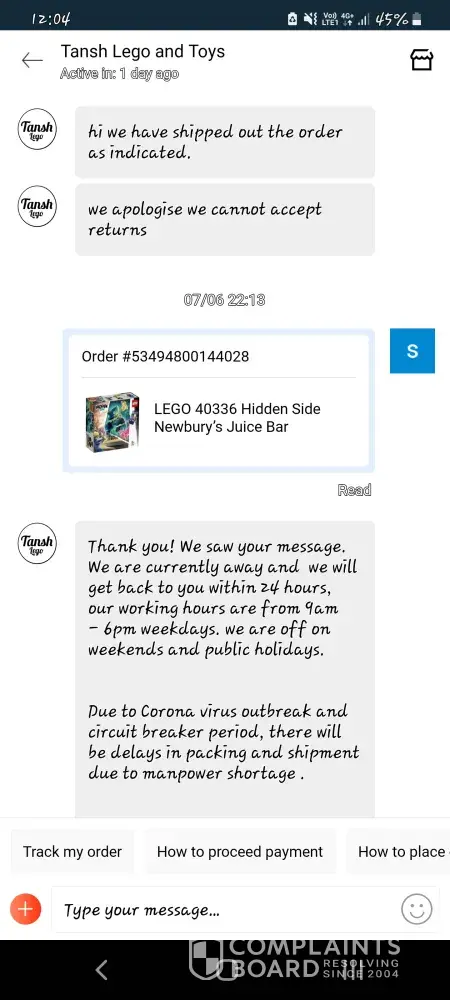 Complaint again to customer service and was told will provide a satisfactory resolution. Just received response today that it has been rejected as seller already shipped item and we should have checked! This is ridiculous! Pls I demand for a refund! This is really a dishonest seller as I noticed I had purchased with him/her before at another platform and had issues too!
