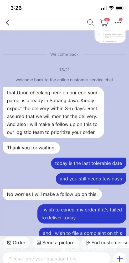 As stated and committed by lazada, 30/7 is last allowable delivery date. However when I checked on my status thru cleo and lazada fb, I was told to wait for another 3-5 days.. Else cancellations and refund will be performed after 15days, this is cheating customer and not acceptable
