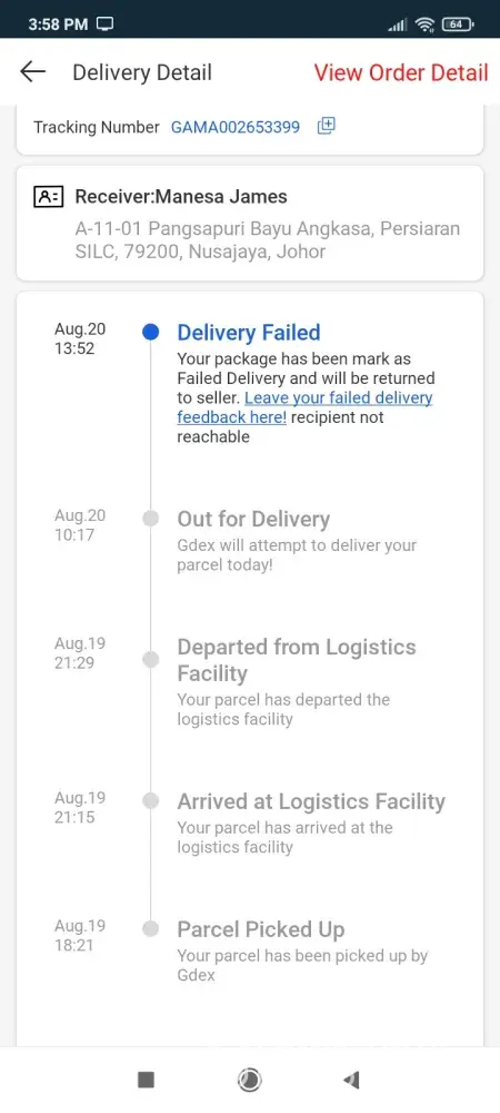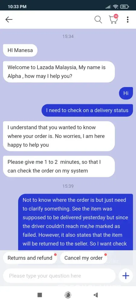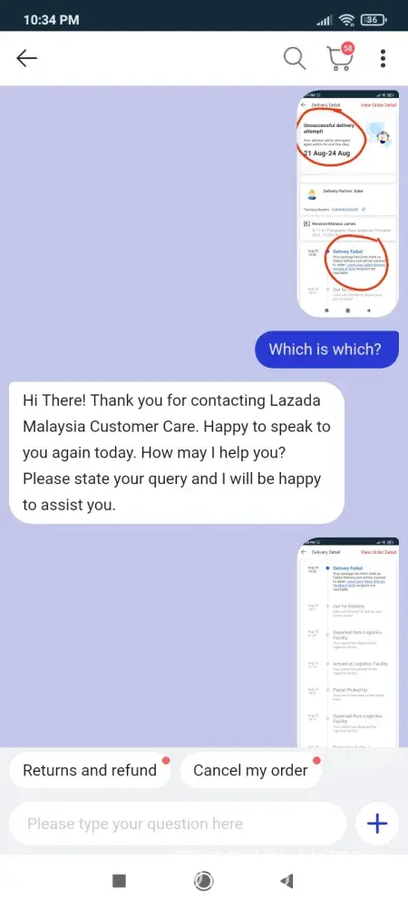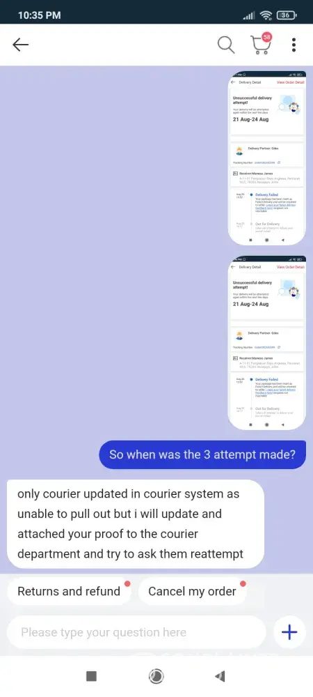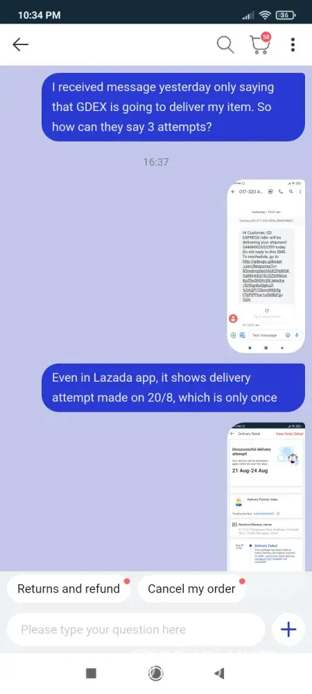 I made a purchase on Aug 14 (Order No: [protected]) and I suppose to receive the package by 21 - 24 Aug. On Aug 20 @ 10:31am, I received a SMS from GDExpress saying that a rider will be delivering my package on the same day, which is Aug 20. I received a call from the rider at 1:51pm but unfortunately the call was missed. However, I tried to call back the number and it was unreachable. So then later in the evening I checked the Lazada apps and discovered that the delivery was marked as failed and the package is being returned to the seller but at the top, it says that another delivery will be attempted in the next few days. On Aug 21, I reached out to Lazada live chat agent to get a some clarity on the delivery status and the 1st Agent by the name Alpha something told me that the courier tried to deliver the item to me 3times and exited the chat right after informing me this. And then I had to wait for another 25minutes to get another incompetent Agent, by the name of Prevena to tell me the same thing. So I sent Prevena the screenshots to proof that the delivery was only attempted once. She told me that she will escalate the issue to the related department and when I asked her when would I receive a response, she replied to me quite sarcastically saying that she have mentioned before in her first statement. And when I told her I want an immediate response, she asked me to call the courier company on my own and even had the audacity to ask me to Google the number! Come on, is this the standard of your customer service? If everything I need to do on my own, what is the need of Agents like Alpha or Prevena? They didn't clarify as to what will happen to the amount I've paid nor assisted in getting the number of the courier company. I am quite honestly mortified with the level of servitude of these Agents. I am hoping that someone takes this complaint seriously and train those Agents to be competent because I have been a loyal customer of Lazada for quite some time and have spent alot in this platform. When I experience this kind of attitude, I just feel like giving up and am on the verge of taking my business elsewhere.
