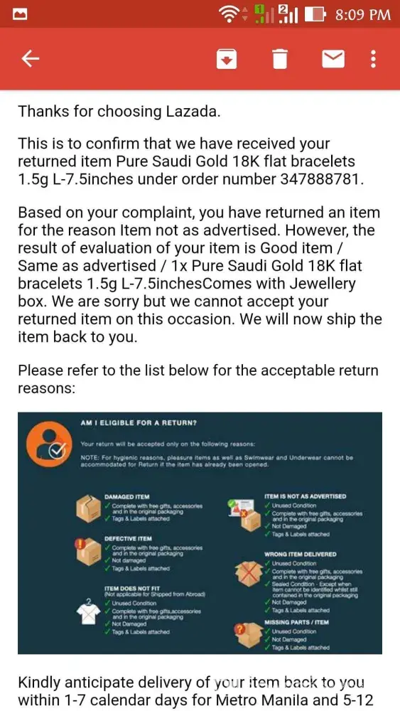 Omorder kami sa lazada ng 18k saudi gold bracelet with a weight of 1.50 grams.. Pero pag recieve hindi tugma sa kung ano nakalagay na description.. Nung tinimbang nasa 1.1 or 1 grams lang! Manloloko kayo you mislead people and agad po namin binalik since nagbayad kami ng 5k para sa 1.5 grams na item only to found out 1 grams lang! Sobra kayo manloko, mandaraya hindi po namin pinolot yung pera binayad sa inyo kung saan lang at ang item na yan pang regalo sana sa kapatid namin sa pasko pero.. And we ask for a refund sa lazada pero binasura nila yung reklamo namin at ayaw ibalik ang pera namin.. Everyone should know this.. Patagal ng patagal nanloloko na ang lazada at ayaw pa ibalik ang pera namin.. We will spread this to all groups online and lastly we will file a report sa dti sobra sobra na kayo lazada