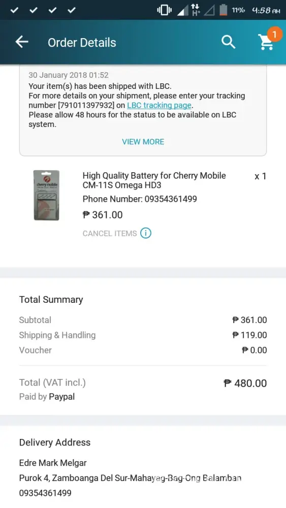 January 26 nag order ako ng battery sa lazada at binayaran ko to sa aking paypal account at tapos ko mag order sabi nila maghintay daw akong +15day kasi ipina sea travel daw, pero mag iisang buwan na wala paring delivery na dumating kaya cheneck ko sa LBC tracking page ang order ko at nagulat ako kasi sabi nila "Your shipment was not delivered due to payment issues during delivery. Please get in touch with us through our official customer care channels." kahit bayad na ako sa dilevery bakit ba ito nangyari masasayang lang ang pera ko..paki tingin ang picture yan po ang proof of paying ko sa kanila pero hanggang ngayon wla paring dumating