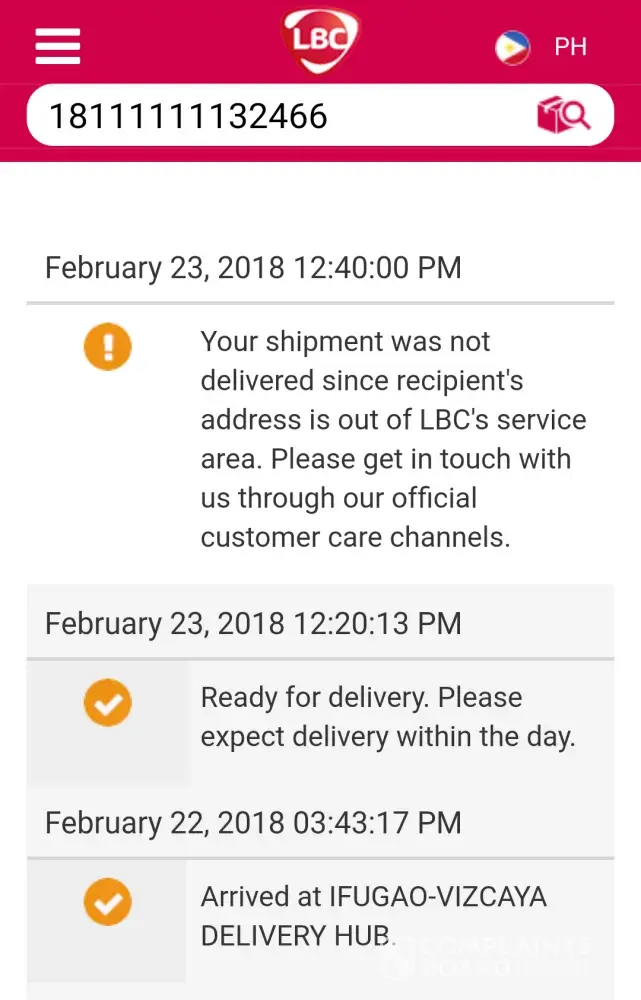 Hi, we ve been receiving all my orders through lbc at our location diadi bugnay nueva viscaya but this last shipment they send us a mesaage that we will receive our order yeaterday 23rd but no showed up. I checked the tracking number and it shows the delevery failed because its outside of their dekivery zone! Are they crazy? How can it be out aide of delivery area while weve been receiving our deliveries many times already? Please fix your team lbc or else I will post and share my experience in social media. Here is my tracking number [protected]