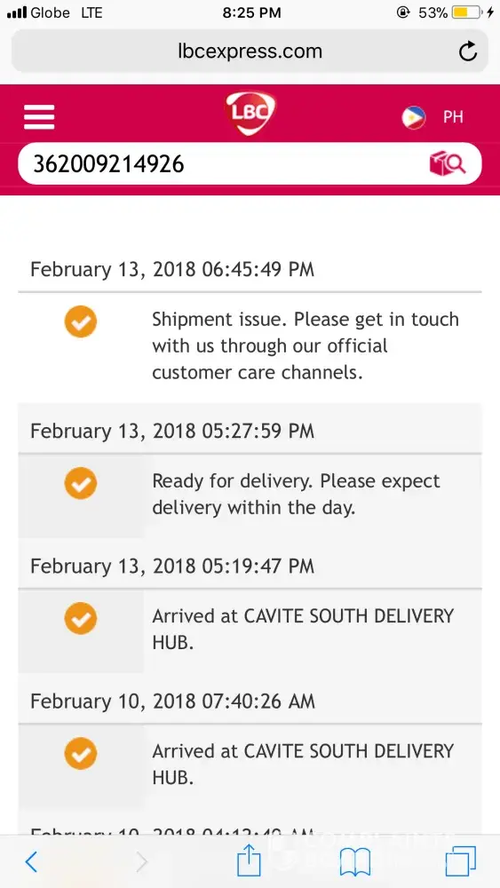 I am here because of my concern regarding to the packaging that still not arrive. LBC already texted my last feb 3, 2018 that my order is ready and will deliver within the day unfortunately there's no package arrived. Then on feb 5, 2018 again LBC texted my that my package is ready to be delivered within the day, but same thing happen there is no package arrive. Are you fooling me?! LBC cagayan de Oro! Don't try my patience. I adore LBC but now? I doubt! Please make some actions about it.
