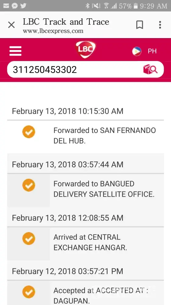 No feedback as to where is the parcel now. As per online tracking, parcel has been forwarded to Abra Bangued Delivery Satellite Office Feb13 3:57am then after few hours that is 10:15 am, same day, it has been forwarded to San Fernando Delivery Hub and my dismay upon knowing that it was San Fernando Pampanga! Please give us correct/accurate report on this! Where is the parcel now! The recepient hasn't receive it yet! This is causing us worry and stress already!