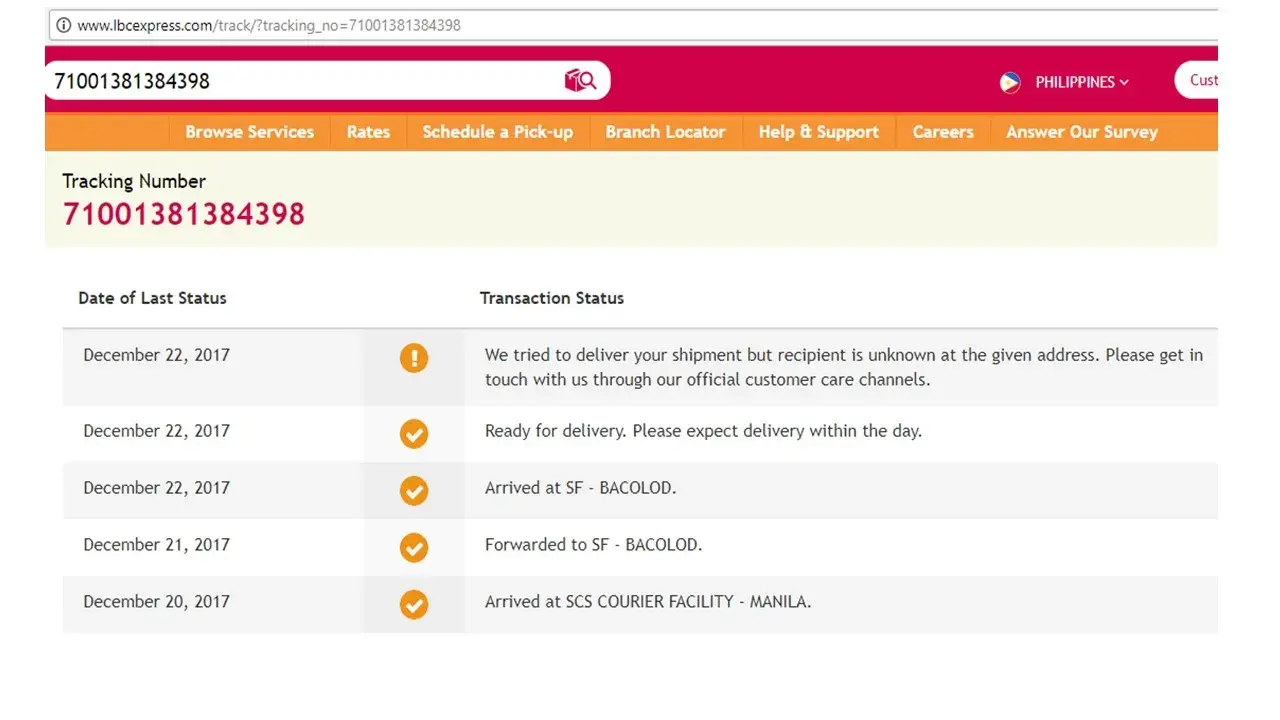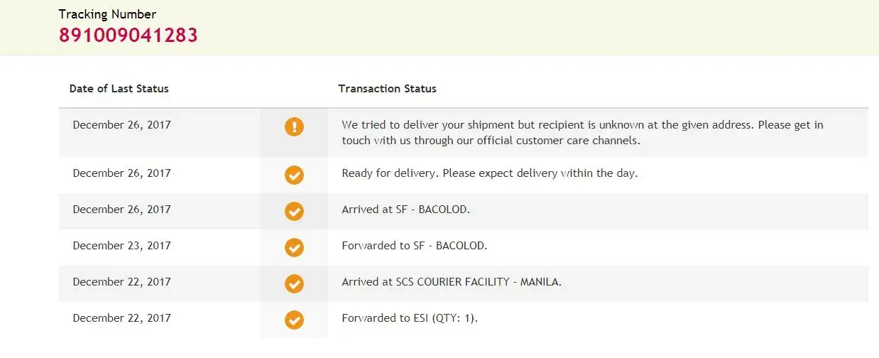 I would like to ask regarding my order with tracking number [protected], when will you again send it out for delivery, since according to the LBC tracking, it says that " you tried to deliver the shipment but the recipient is unknown at the given address. Please get in touch with you through your official customer care channels". While LBC tracking after ship shows that you tried to deliver the above-mentioned shipment 9:31 PM on December 22, 2017, and looking at the time the consignee is really not there because it is already 9:31 PM and the address of the consignee in that parcel for shipment/delivery is her office address but there is a guard in that office waiting anytime for that said delivery wherein the consignee left an exact amount of cash for payment in case you will deliver it anytime.