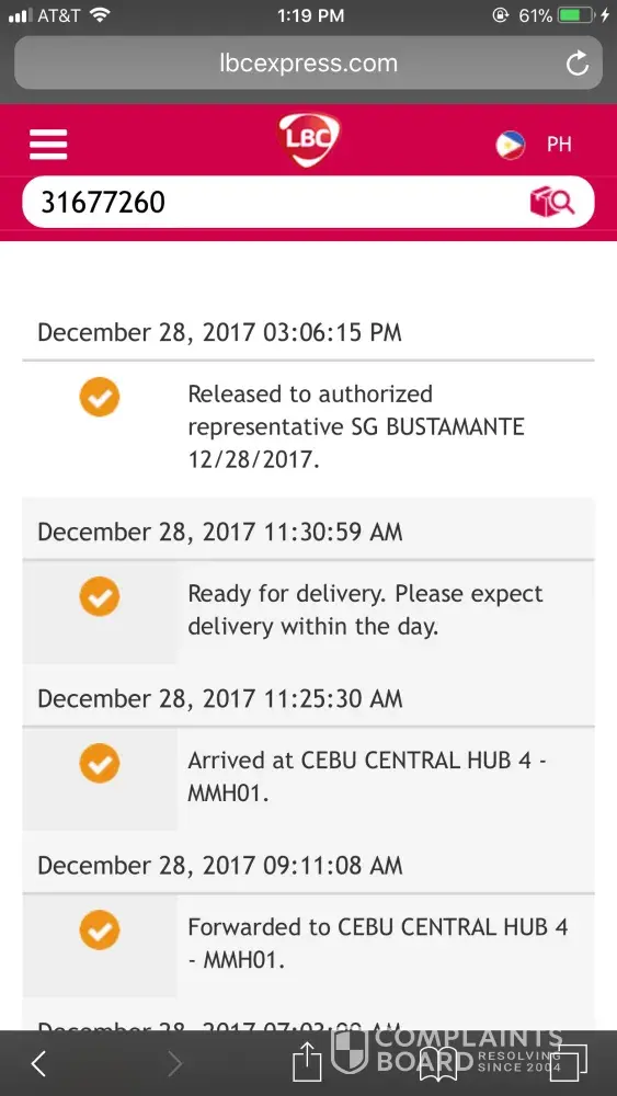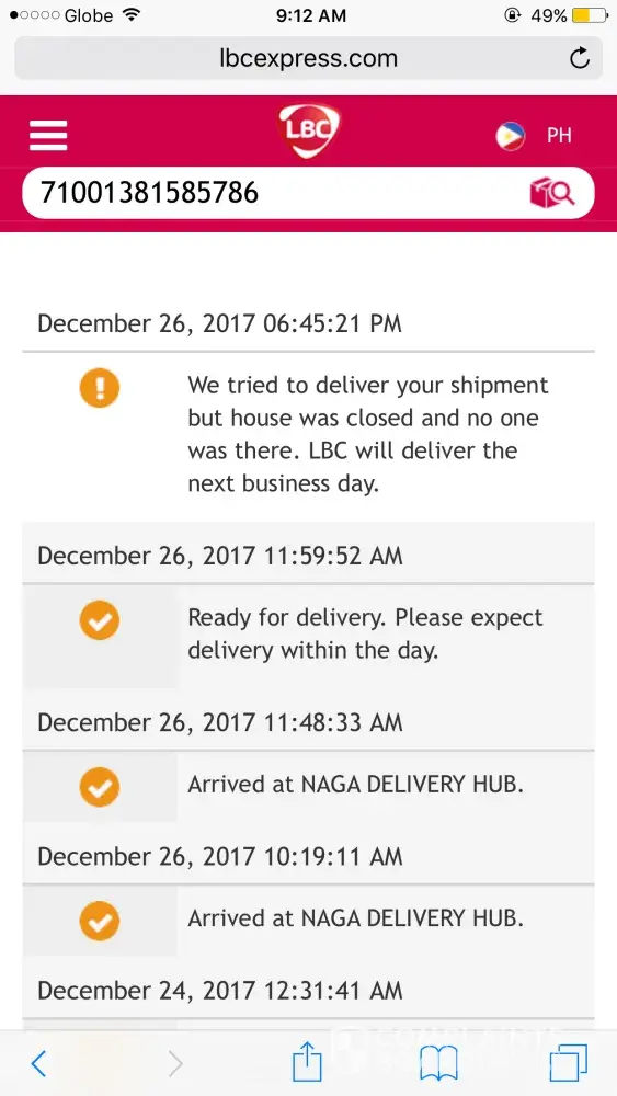 Since nung 26 po na deliver yung package sa bahay kaso wala ako the the next business daw so dapat 27 nareceive ko na yung package yet wala pa sana dumating ngayon 28. Thanks. Need ko na yung package eto yung tracking number [protected]. Yet wala pang update po sa lbc tracking website sana po di man lang nagtext kasi kung may delivery nun buti pa yung lazada.
