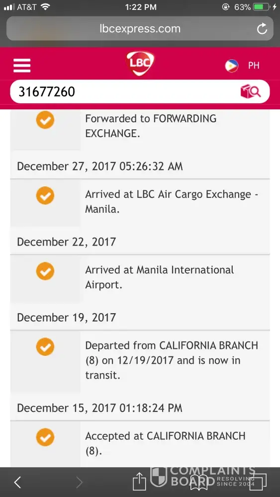 It was last December 31, 2017 the item arrived as I monitored my item online but it was Sunday so they're close until January 2, 2018. On January 2, 2018, I went to the warehouse to pick up my item but the lady said it was not yet there and they will contact me. Just this January 5, 2018, I went to check on my items because not one phone call arrived on my phone and sad to say they already shipped out my item back to the sender which is my supplier last January 4, 2018 at 5 o'clock in the afternoon for the reason of their courier is that I cannot be reached out when they called. It is so impossible if they called me how many times and still I can't be reached, I was in town on that day and I have strong signal. We have small business and costumers are waiting for our products, because of this our costumers are discouraged. Please please improve the system, it just got worse. I'm referring to the Dumaguete City LBC Warehouse. Thank you.