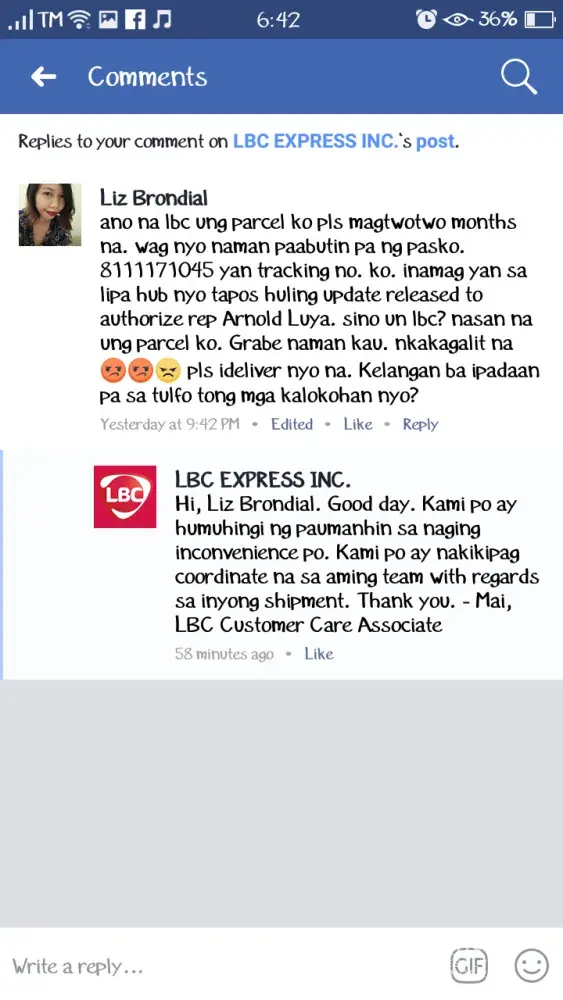 To the manager of LBC Branch Lilo-an Branch gusto ko lng mga complain bakit until now di pa nadedeliver ang pinadala ko last dec. 06 2017. Dapat nung friday pa ang delivery nyan. At ng itrack ko sabi Shipment Issue what do you mean by that? Akala ko ba pinaka mabilis na serbisyo ang binibigay nyo baket parang sakit lng ng ulo? Please lng ayusin nyo to.