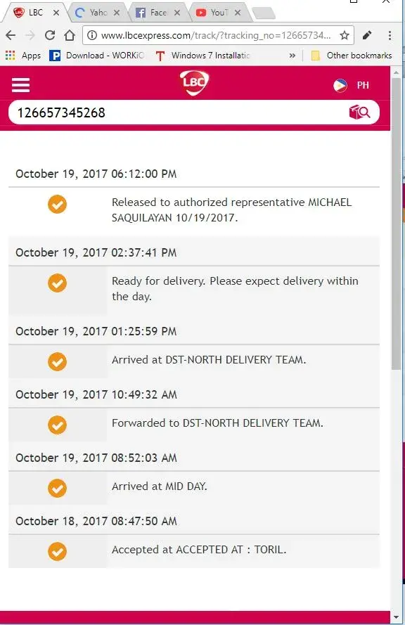 A LBC Deliveryman informed LBC or our parcel status and it is reflecting on the online tracking that it was delivered and released to authorized representative one of our guards Michael Saquilayan with the parcel document on oct 19 at 6:12pm, but it was never delivered nor received by our guard Michael Saquilayan at the said day and time.