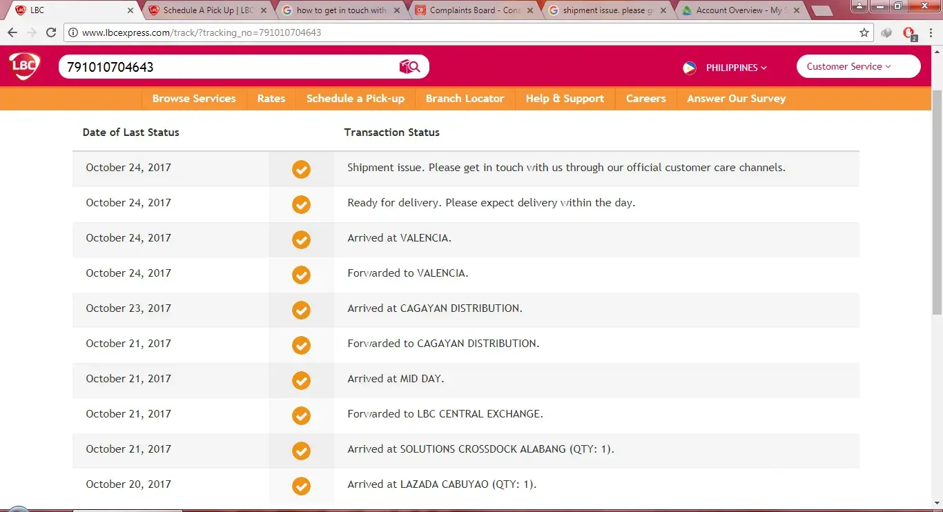 This is the first time na nangyari to sakin, kasi pag nagshop ako sa lazada they will inform me na dadating na yung package and best part is tatawag pa sila pag malapit na. Yubg delivery niyo LBC may nagmemesage naman na dadating na, twice na 2 days ko ng iniintay pero hanggang ngayon wala pa. Nakakaabala lang kasi, nagwowwork ka tas nakikipasuyo kana lang bg pag iiwanan tapos wala pa. Trinack ko yung package ko 10:00 am kasi LBC texted me at 9:23 am, nubg asa website niyo na ako 9:10 am your package will be delivered then 9:36 am shipment issue na. Please paki resolve kasi the sum of money we're paying is pinaghirapan yun, and yung abala din. Thank you.