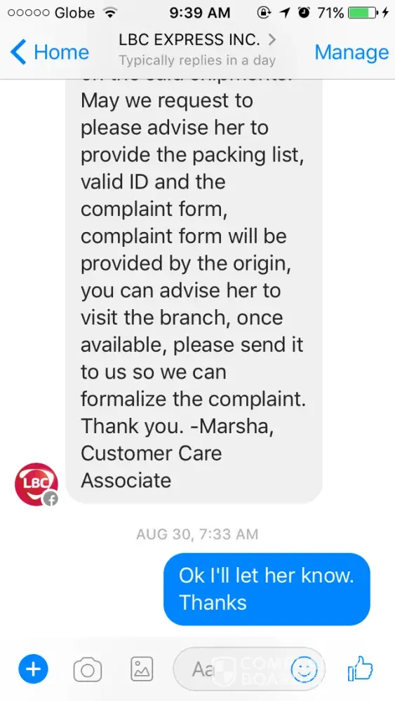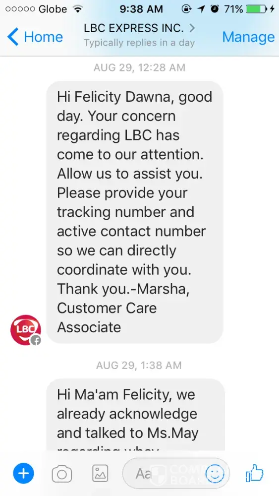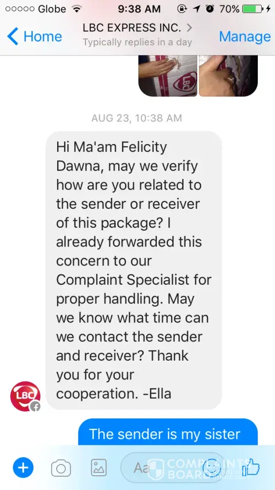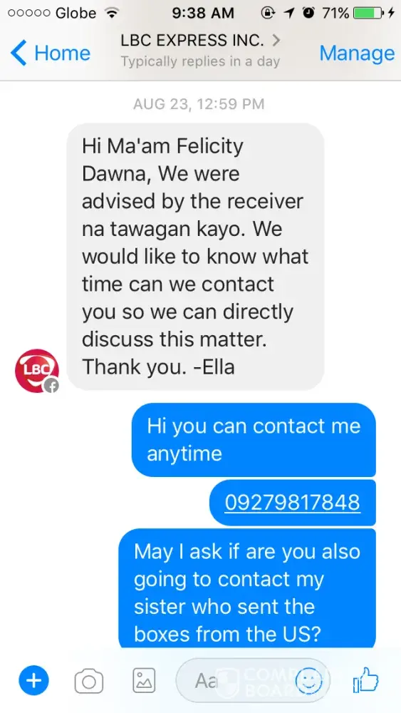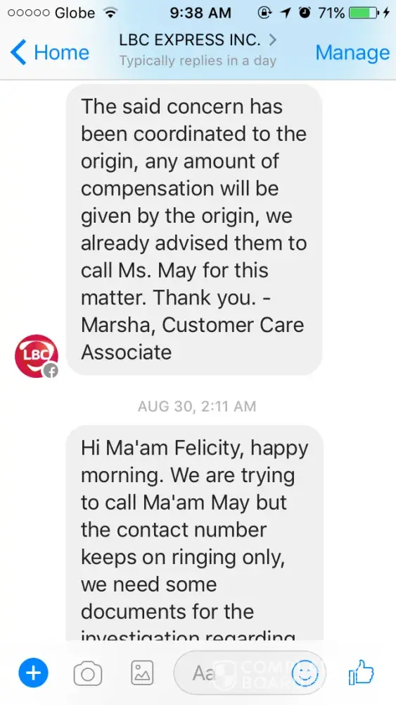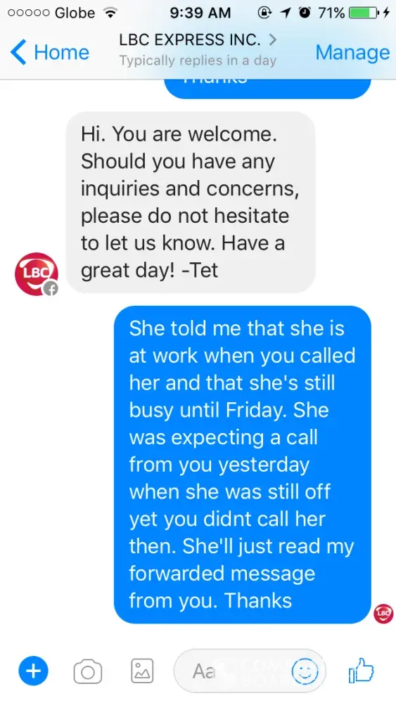 First of all, it has been more than a month since August 22 that we made the complains with regards to the TWO noticeable holes in one of the two boxes we received from my sister in States. I took a video of it and the whole process on how we opened it. A day after you read my post and messages in your fb, you then called me and told me that my sister should coordinate with you, and you even told me that you will have and investigations with regards to this. You even told me that you will compensate the damages of it. My sister wasn't really able to go right away because she was busy with work and it took her awhile to visit in your CA office where she sent the box with. Furthermore, she went to your office today and found out that you didn't even act upon it. She was just being told so, "YOUR FAMILY RECEIVED AND EVEN SIGNED THE BOX WHEN IT WAS DELIVERED, THEREBY IT WAS IN GOOD CONDITION WHEN THEY TURNED OVER AND HANDED IT INTO YOUR HOUSE." Now, let me ask your good hypothalamus, If you were in our shoes, would you bother turning all the sides of the boxes when receiving it?! I bet you won't. Honestly, we didnt really bother checking all the boxes because we didnt expect that we will receive a damage one. We even gave our FULL TRUST to LBC as a courier since my sister used to send with them for more than a decade. Nonetheless, you requested her to come to your office with all these documents. Every conversations we had through messenger were still here and I am going to screen shot everything! You don't have A WORD for all your clients. You are now claiming that it was our fault why the box had turned that way since we received it. Yes, we signed the receive form because it was your protocol to complete the transaction and with our full trust in your company, we didnt expect that it will happen to us. You are not even claiming that there are culprits and KAWATAN in your business. You kept on denying that you have been having staff who always do this kind of stuff to the packages hardly earned why the senders who entrusted you. Don't you ever think that you have to penalize and even convict those stealing the things in any packages being handed over?! You have to prove us that you still withold your CREDIBILITY and as what you are still claiming to be #HARINGPADALA! What a shame in your management for giving false reassurance of compensating the damages your staff had caused! Another thing, you told me when you called up that the holes were caused by the unpredicted clashing of boxes during transport but how come you are claiming now that we received the box in a good condition because we signed it?!? You even demanded me to remove my post because it is damaging to your reputation. Do you think I will remove it?! People deserves to know the truth about your messes!