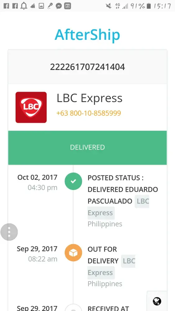 Just today October 2, 2017 at around 3:30 pm in the afternoon we received the last package from my sister in Kuwait with Tracking No. [protected].